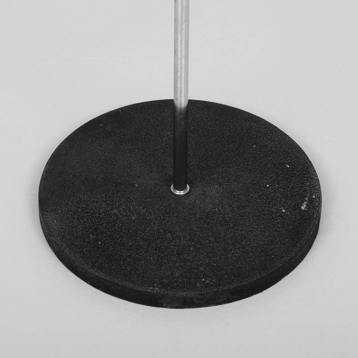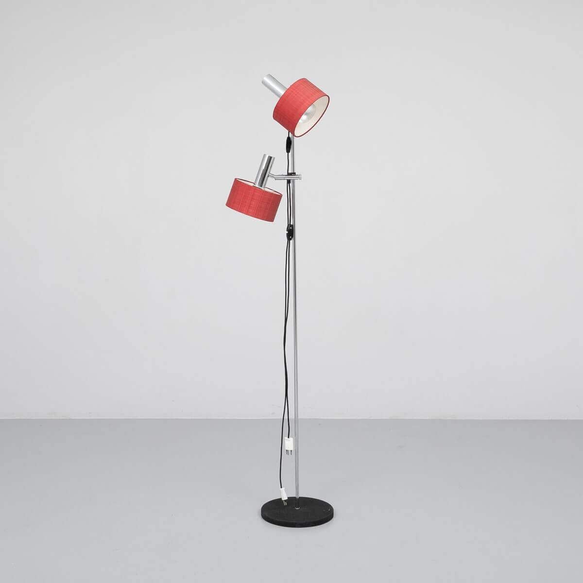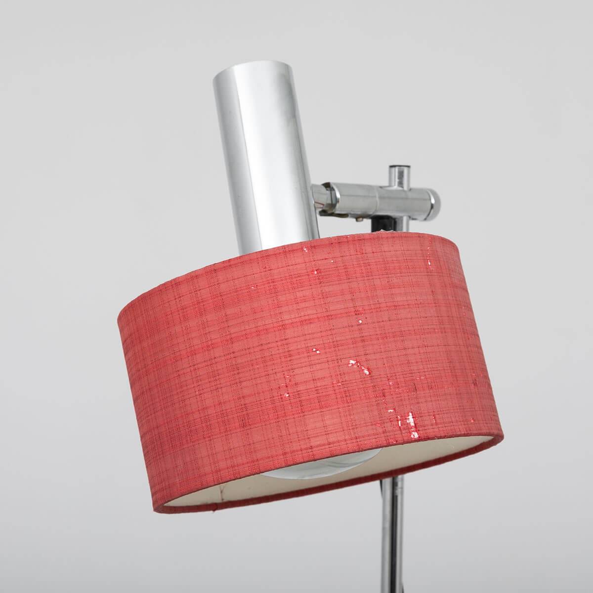 2er Spotlampe mit Stoffschirmen in rot. Schwerer Fuss aus mattschwarz lackiertem Metall. Stab und Halterungen Metall verchromt. Stoffschirme höhnverstell – und schwenkbar. Pro Lampe ein Kabel. Mit Gebrauchsspuren an einem Schirm.