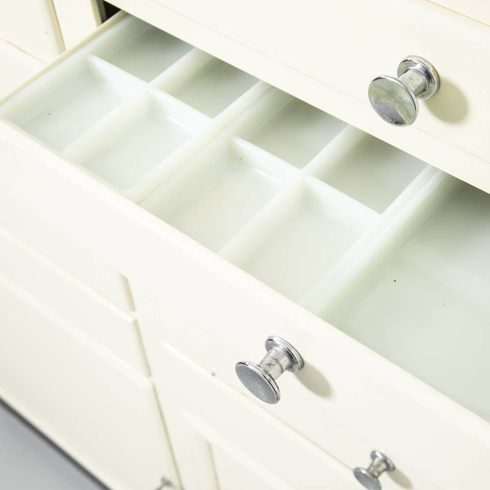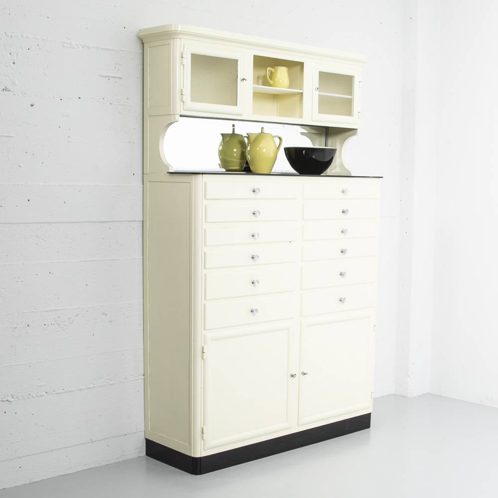 Arztschrank aus lackiertem Metall mit vielen Schubladen. Schwarze Ablage aus Glas und Spiegelrückwand. Sehr schweres Möbel. Für den Transport empfiehlt sich Schubladen, Türen und Tablare separat zu transportieren. Dieses Möbel steht aktuell in der MICASA Filiale in Dübendorf. Es kann dort besichtigt und gekauft werden.