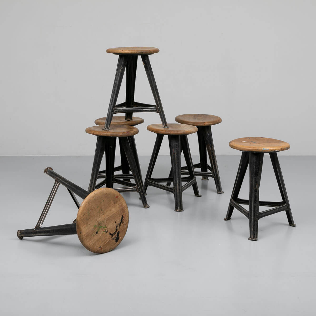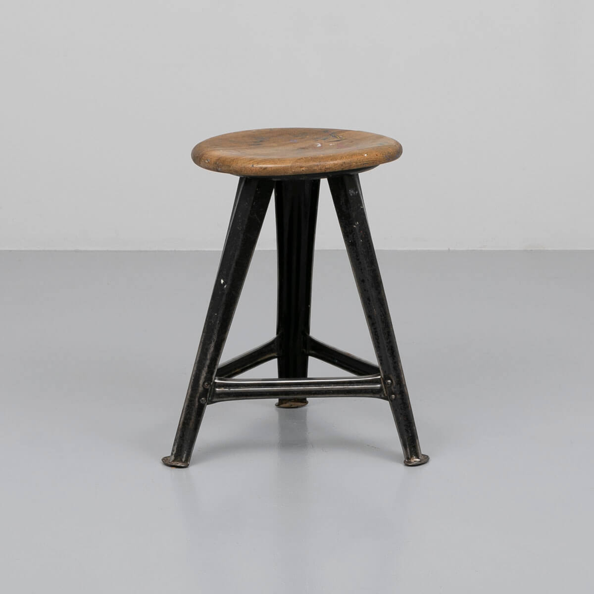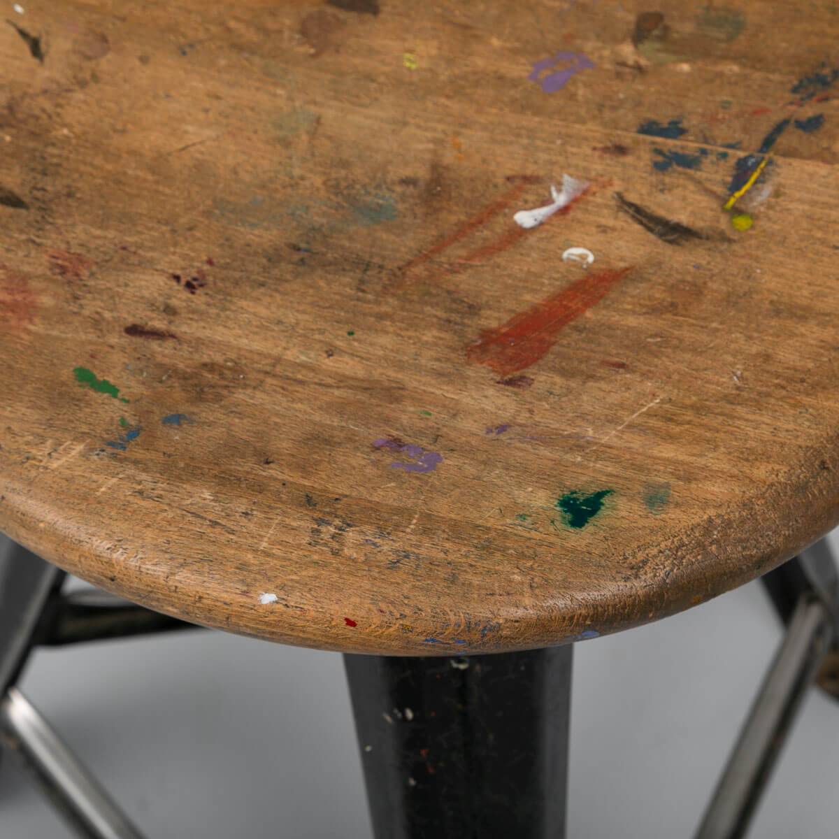 Atelier oder Werkstatt Hocker aus den 20er Jahren. Dreibeiniges Gestell aus schwarzem Metall mit Gebrauchsspuren. Sitzfläche aus Buche mit zahlreichen Farbflecken. Preis pro Stück.