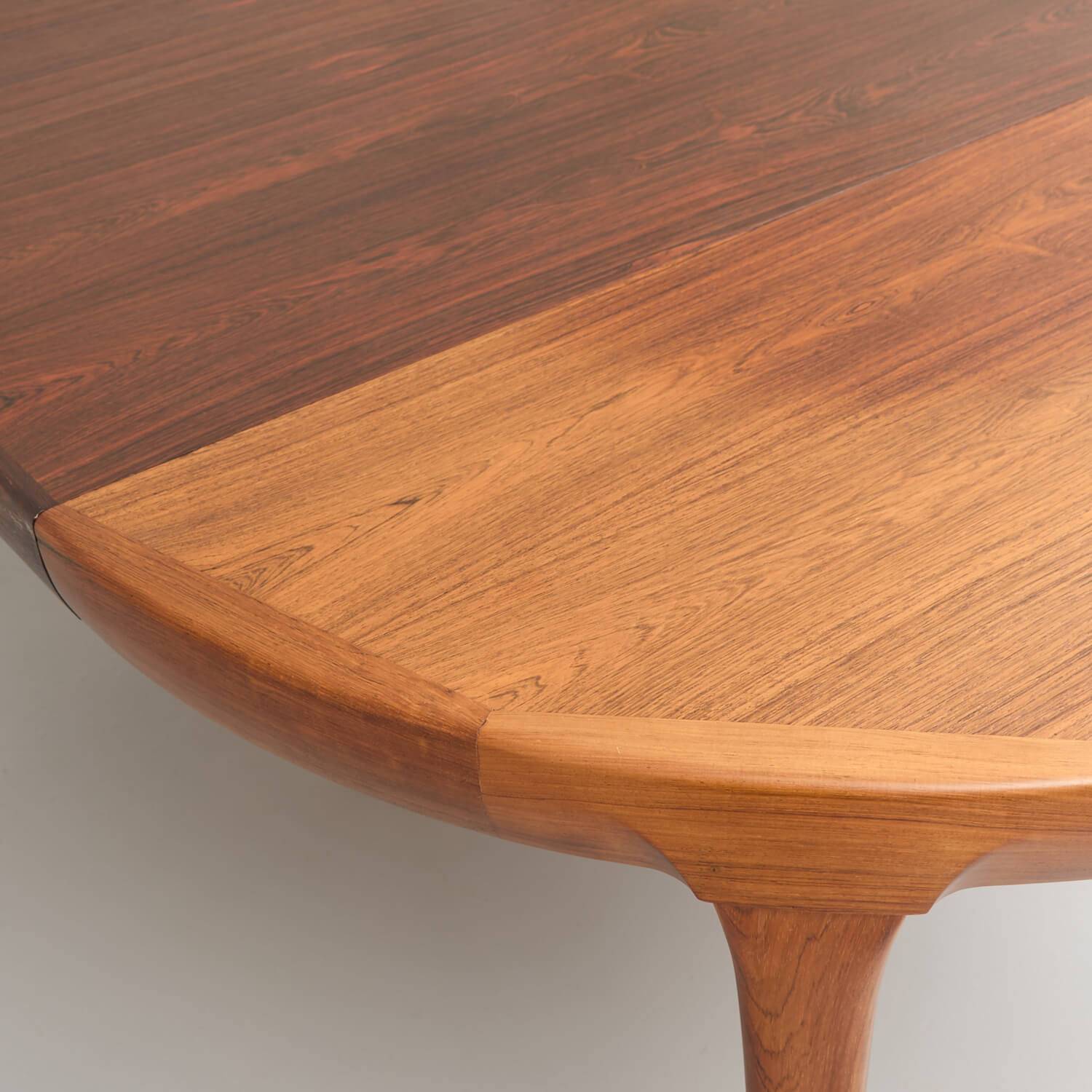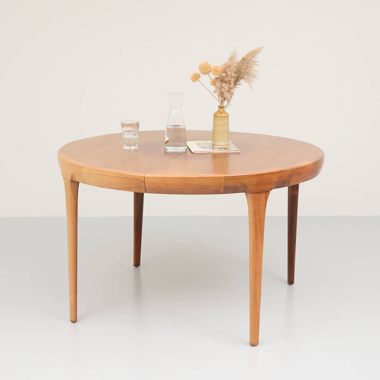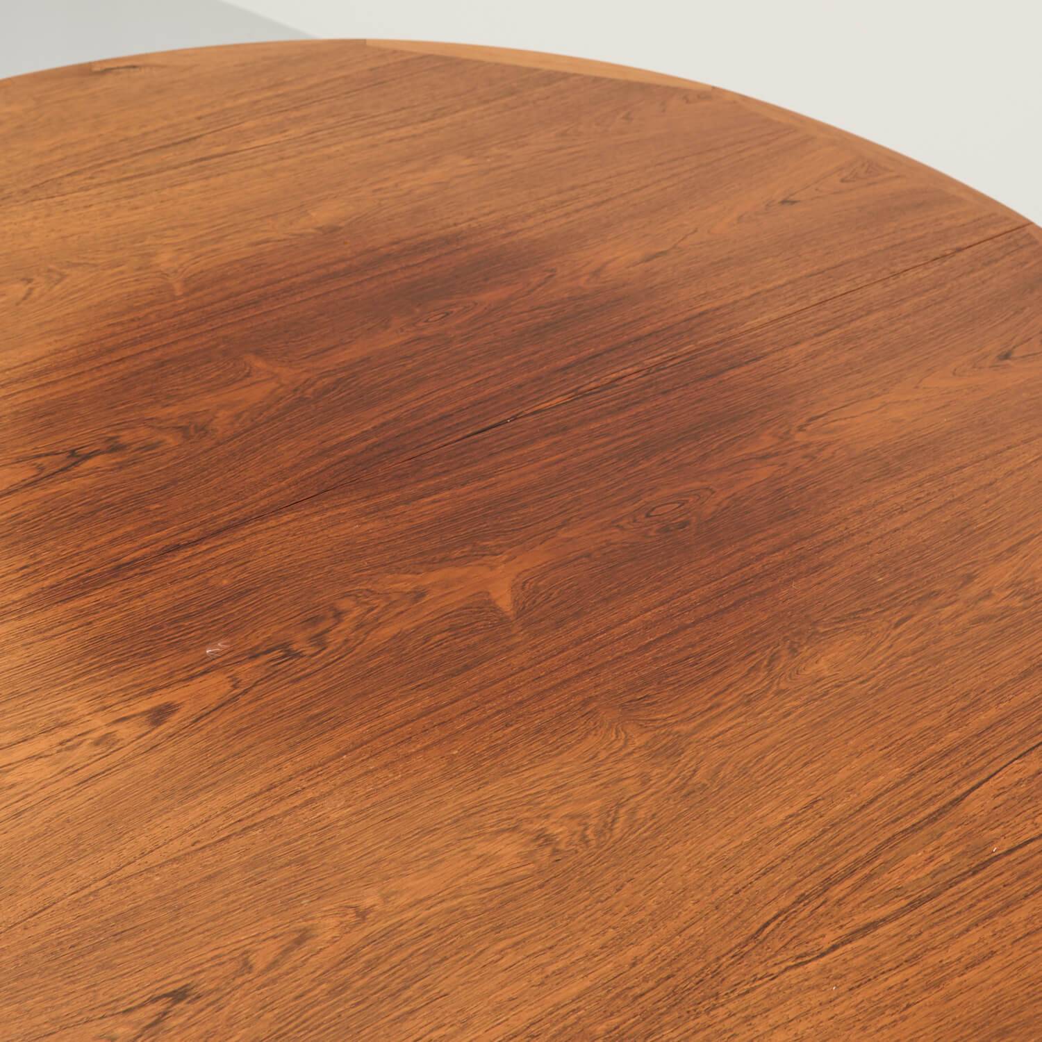 Ausziehbarer runder Esstisch. Dänisches Design von Ib Kofod Larsen. Gestell aus massivem Teakholz. Deckblatt und Einlegeplatten aus Holzwerkstoff furniert. Kleines einfaches Mittelbein, dass sich ausklappt wenn man den Tisch auszieht. Guter Zustand mit Holzverfärbungen auf dem Deckblatt sowie zwei dunkleren Einlegeplatten à je 50cm.