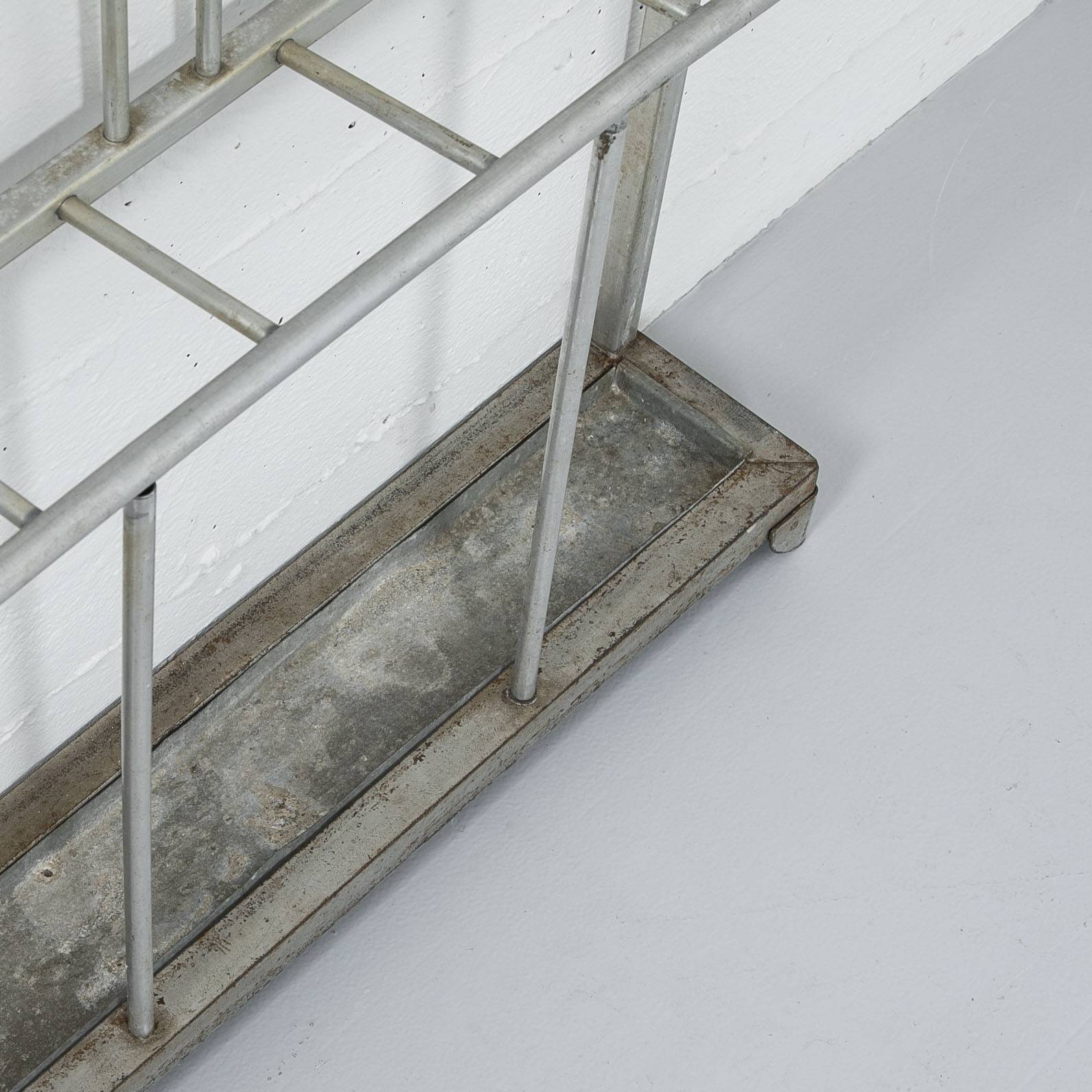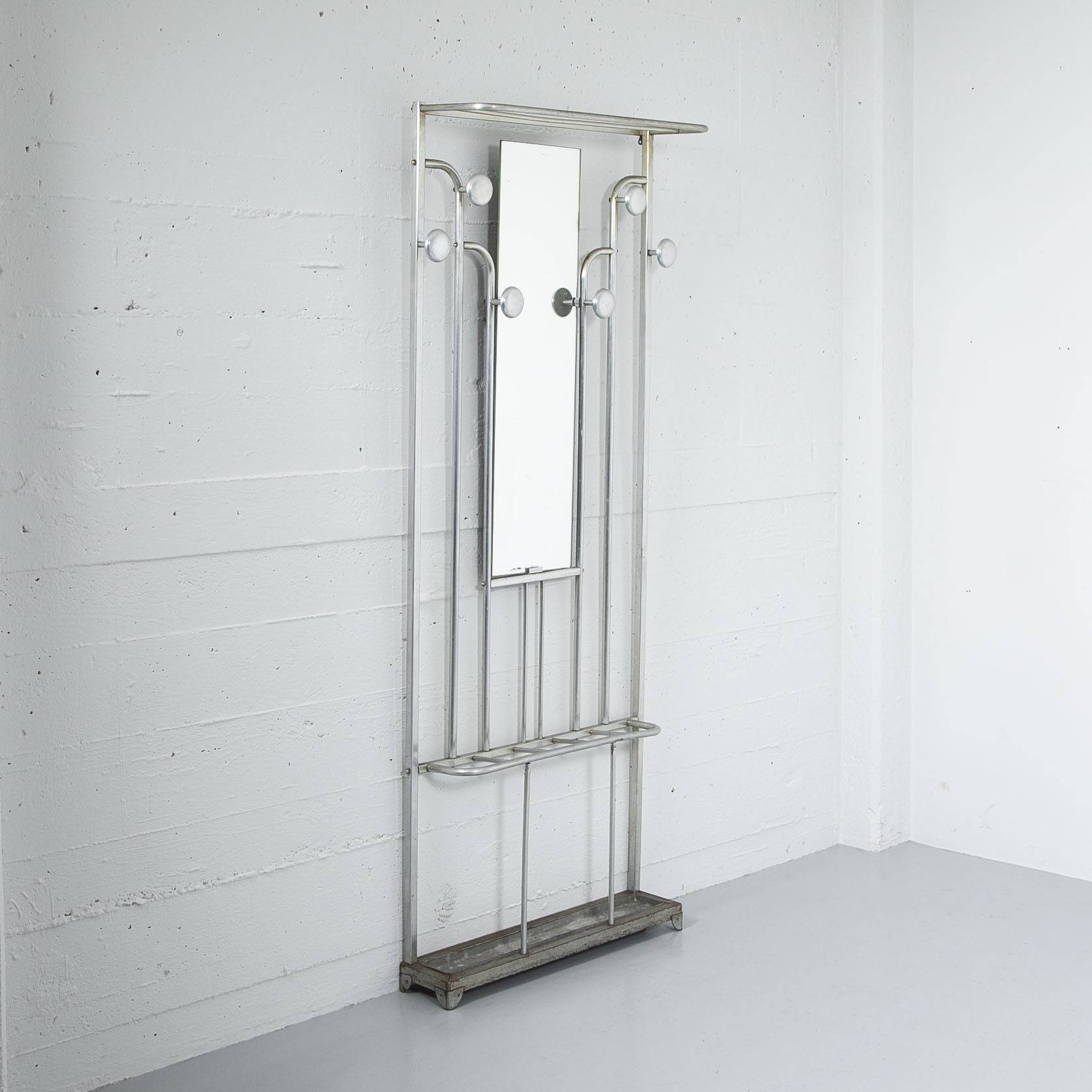Bauhaus Alu Garderobe 1. Gestell mit einem Spiegel, Schrimständer, sechs Haken und einer Hutablage. Zur Wandmontage mit zwei Schrauben. Mit Gebrauchsspuren.