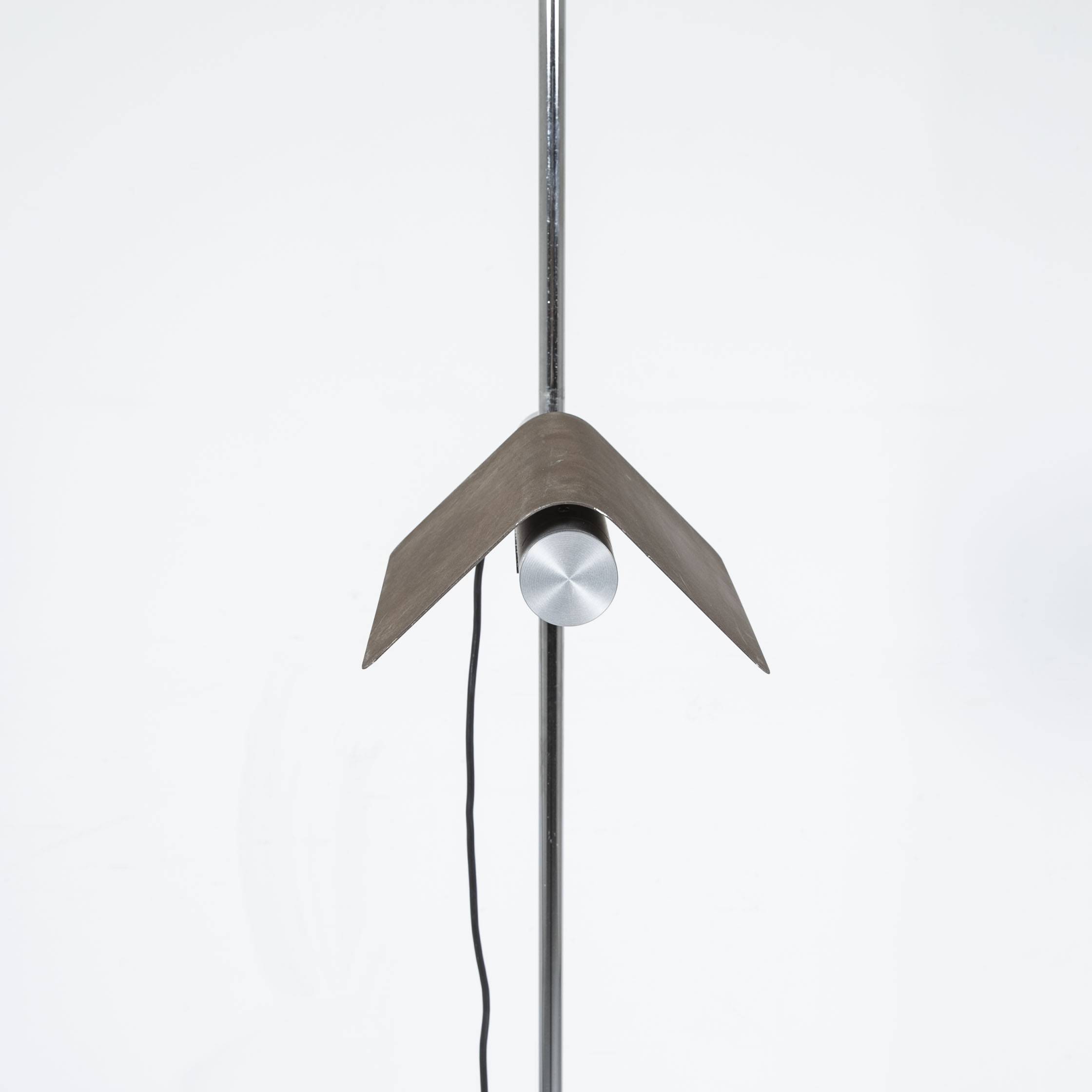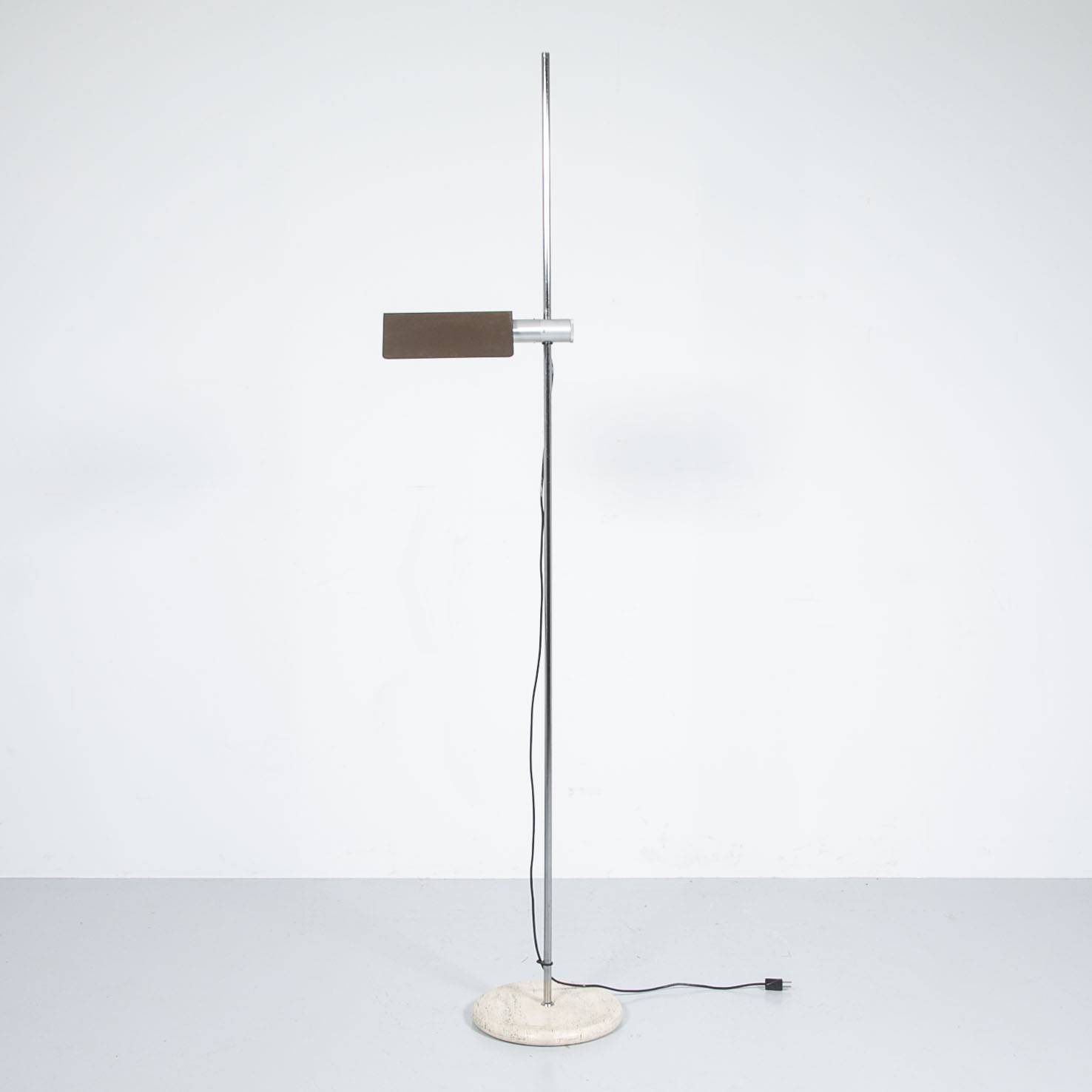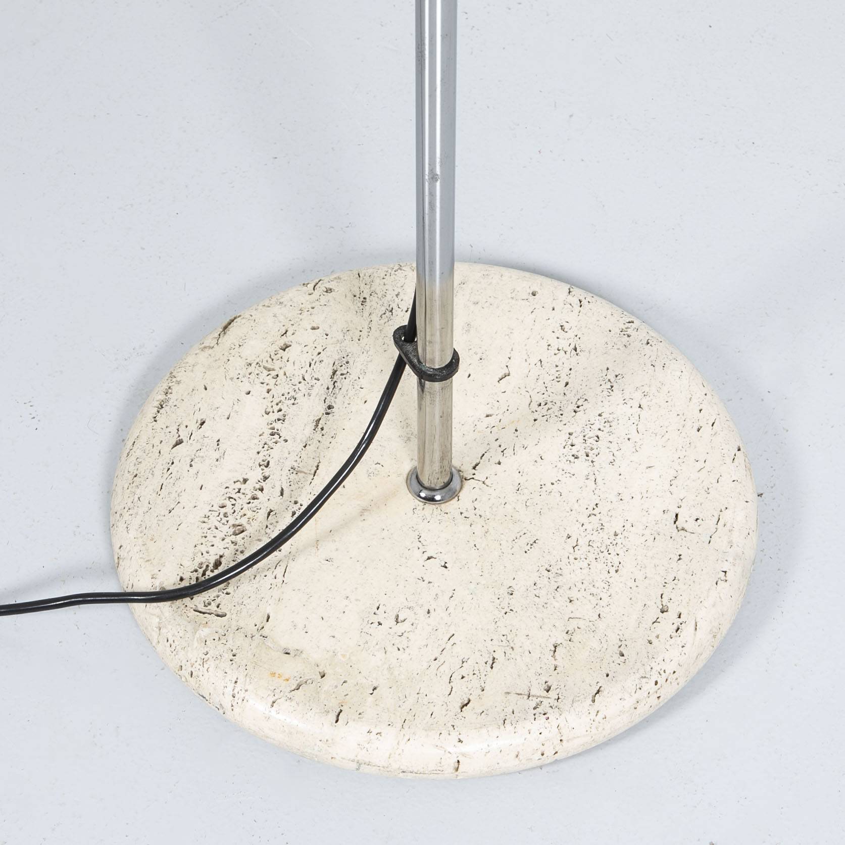 Belux Stehlampe. Runder Fuss aus Travertin, Stahlstab, Lampenschirm aus pulverbeschichtetem Stahlblech, höhenverstellbar und schwenkbar. Mit Gebrauchsspuren.