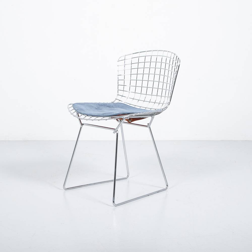 Bertoia Sidechair Chrom von Knoll. Sitzschale und Gestell aus Chromstahl, abnehmbare Kissen aus blauem Synthetikvelours. Guter Allgemeinzustand, Kissen mit Gebrauchsspuren. Stückpreis. Verkauf nur im 4er Set.