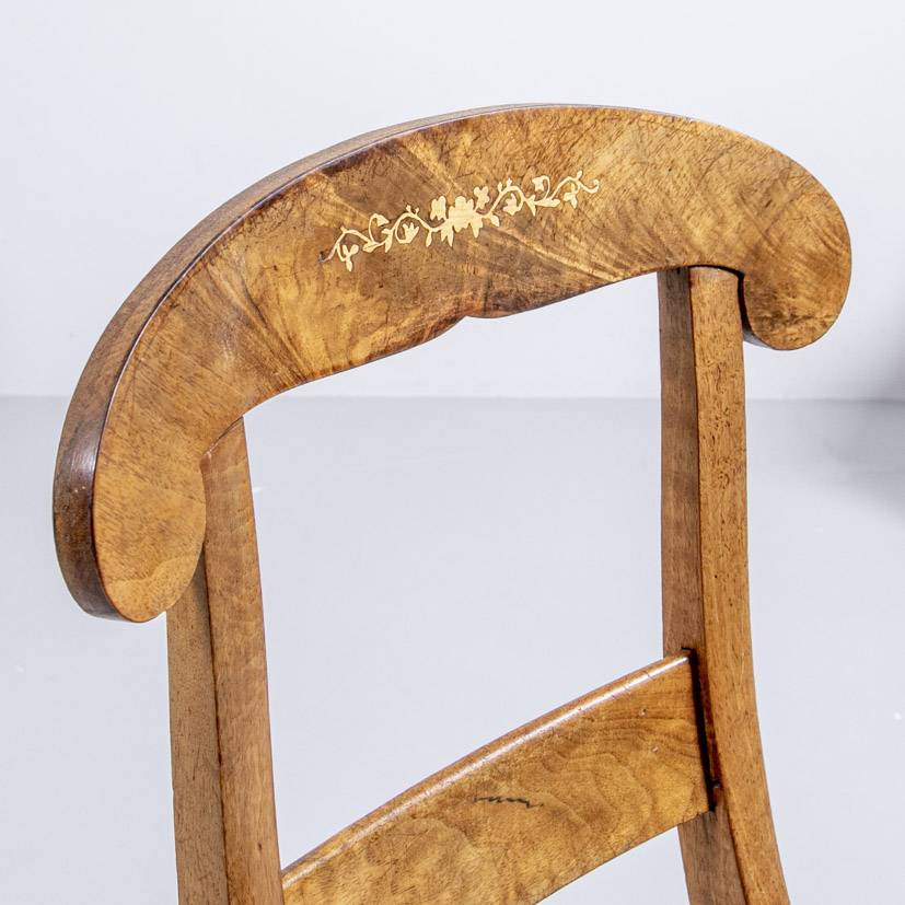 4er Set Biedermeierstuhl mit Wienergeflech. Gestell aus massivem Nussbaum, Sitzfläche aus Wiener Geflecht, mit Intarsienarbeit an der Rückenlehne. Preis pro Stück, Verkauf nur im 4er Set.