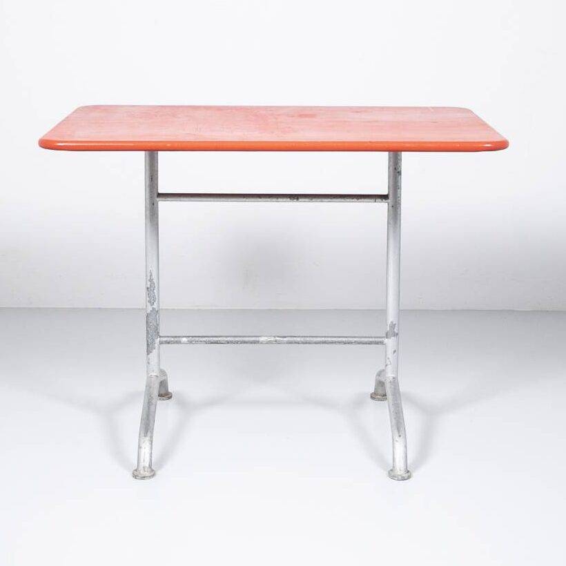 Klappbarer Bigla Gartentisch mit rot lackierter Tischplatte auf silber lackiertem Metallgestell mit Patina.