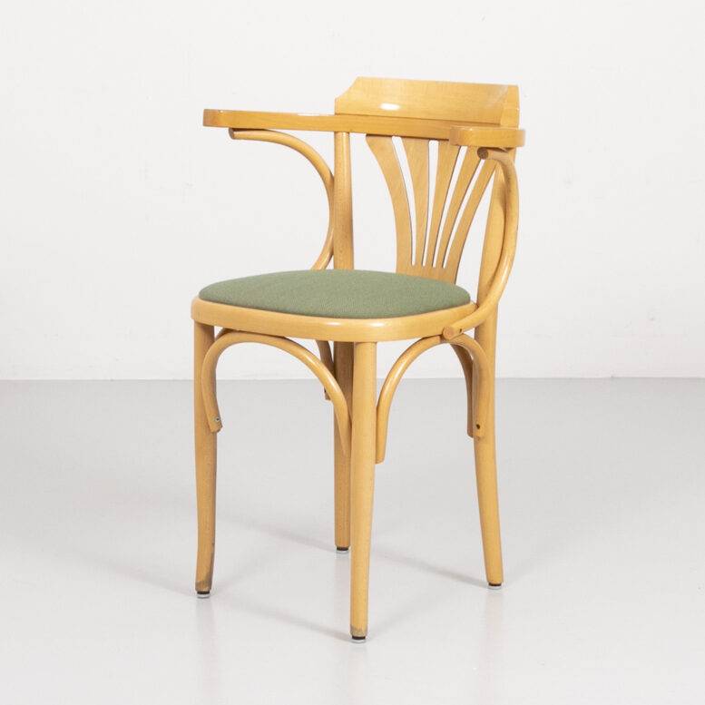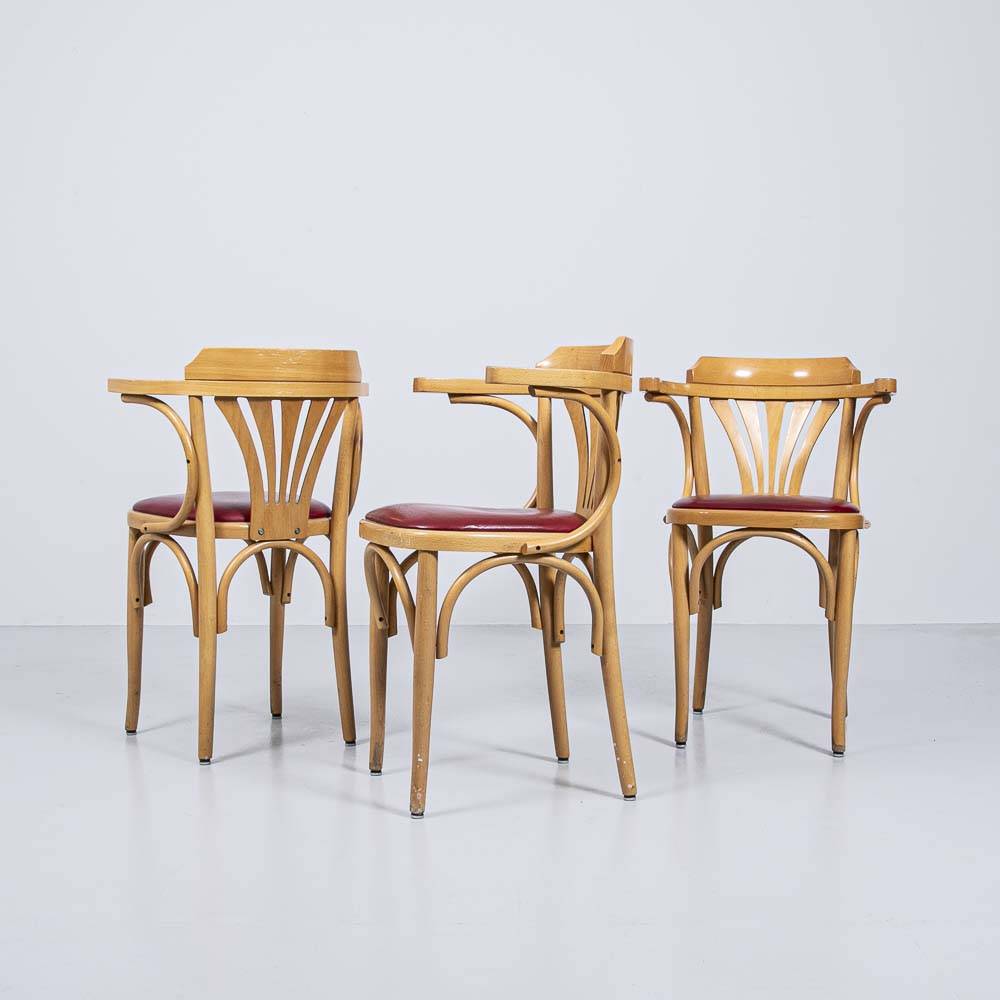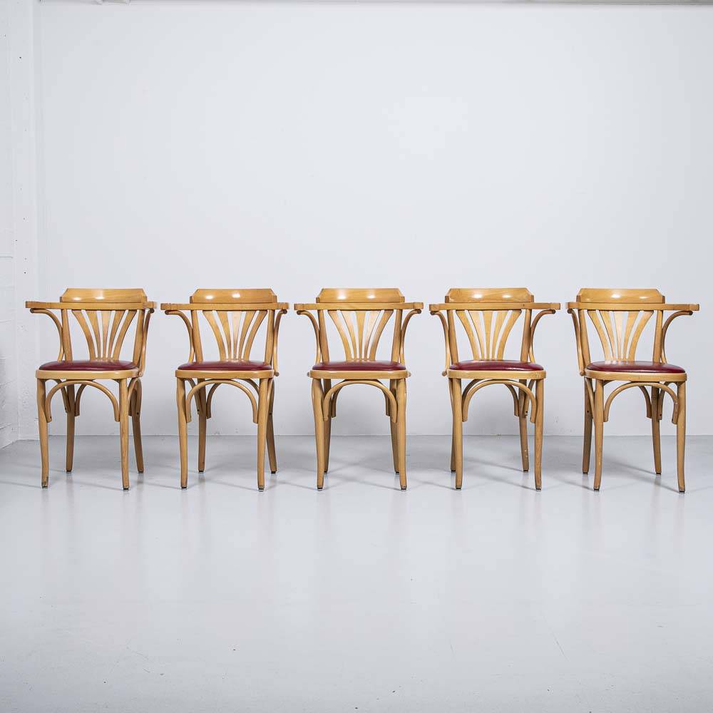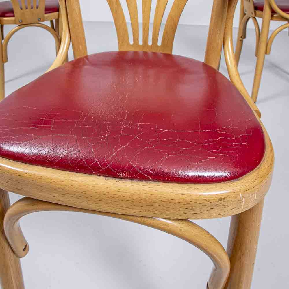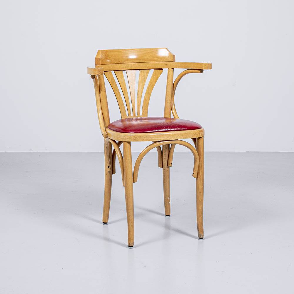 Bistrostuhl mit Armlehne aus lackierter Buche. Rotes Kunstleder Sitzpolster mit altersbedingter Patina. Preis pro Stuhl. Bezug nach Wahl möglich. Stoff oder kunstleder + CHF 80.- Leder