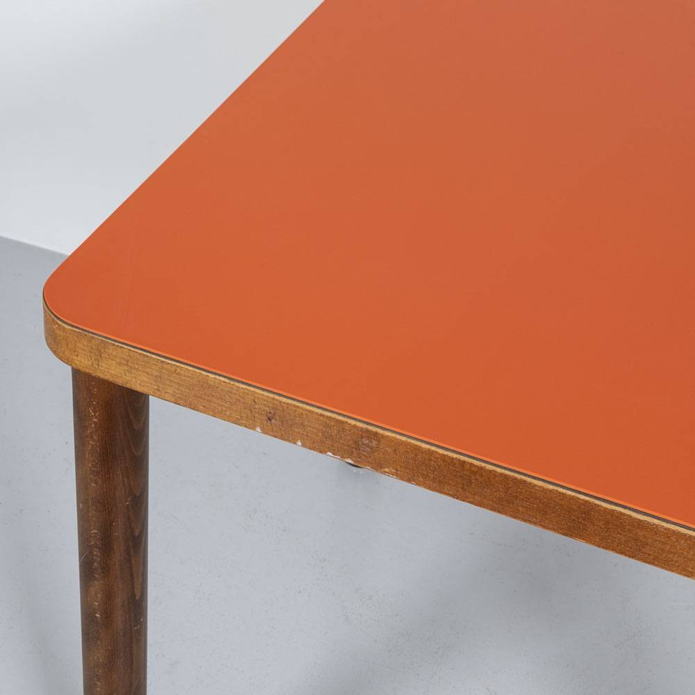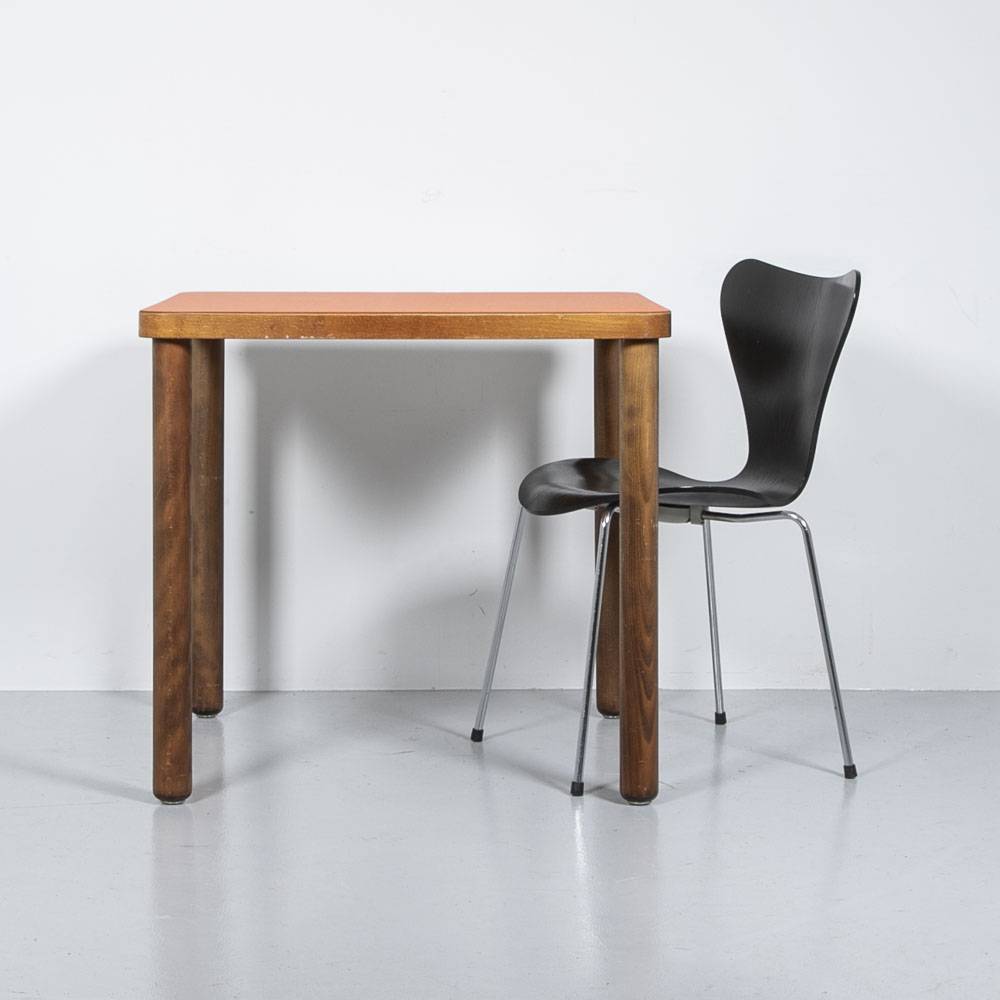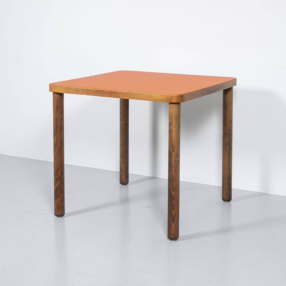Bistrotisch Linoleum Orange 80 x 80 cm. Beine aus massiver, gebeizter Buche. Tischplatte aus Holzwerkstoff, in unserer Werkstatt mit Linoleum beklebt. Mit Gebrauchsspuren an den Beinen.