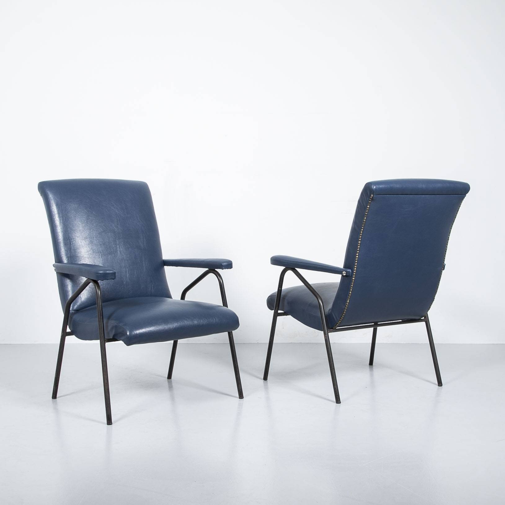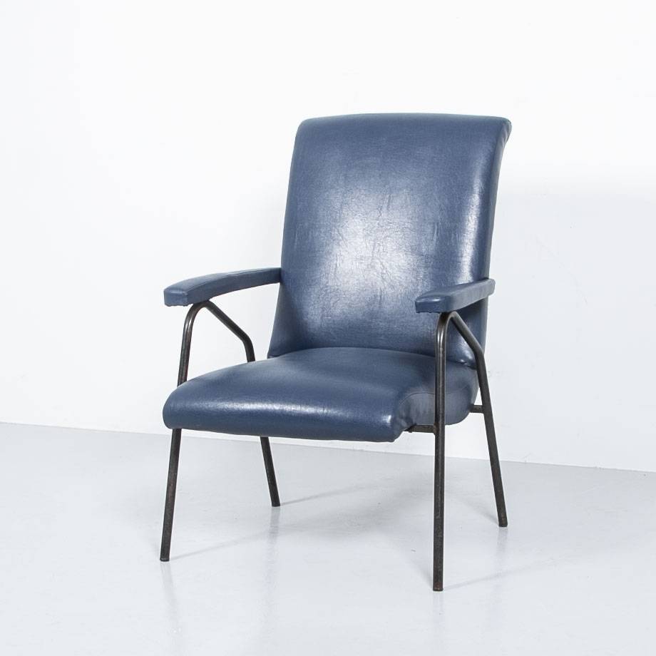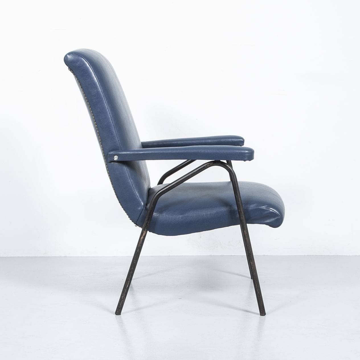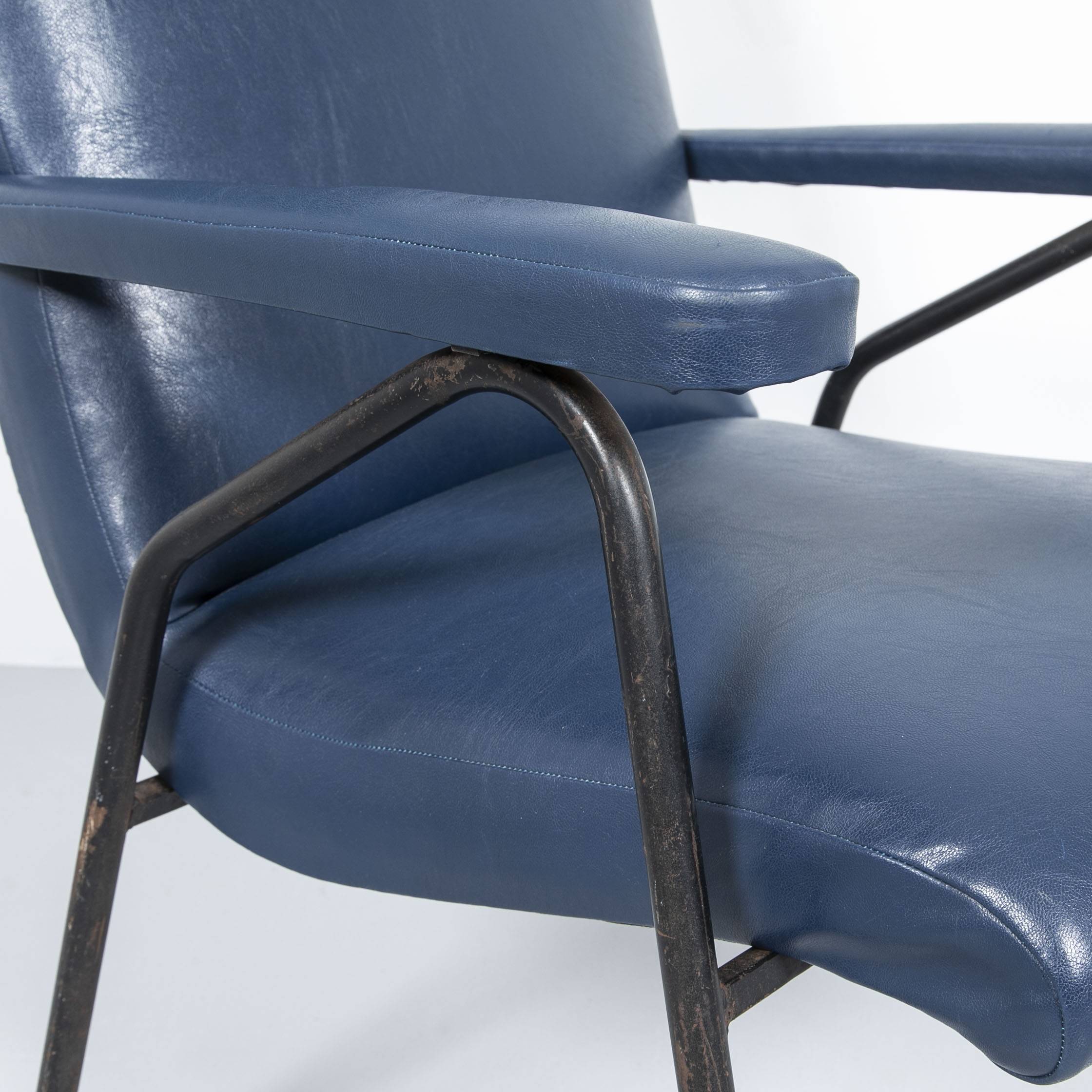 Blauer Kunstleder Sessel. Gestell aus schwarz lackiertem Stahl, Polsterflächen und Armlehnen mit dunkelblaum Kunstleder bezogen. Guter Zustand, Patina am Gestell.