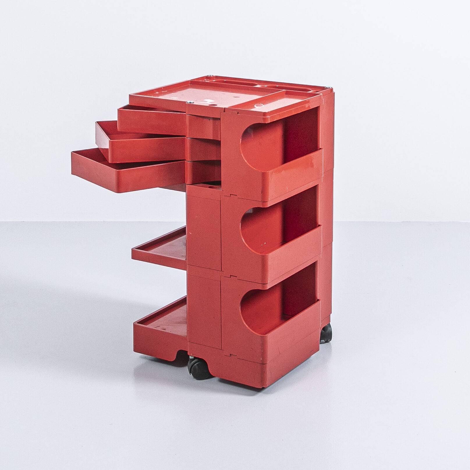 Roter Boby Trolley by Joe Colombo für B-Line. Rollcontainer aus leicht zu reinigendem, spritzgegossenen ABS-Kunststoff. Starke Flecken auf der Ablagefläche.
