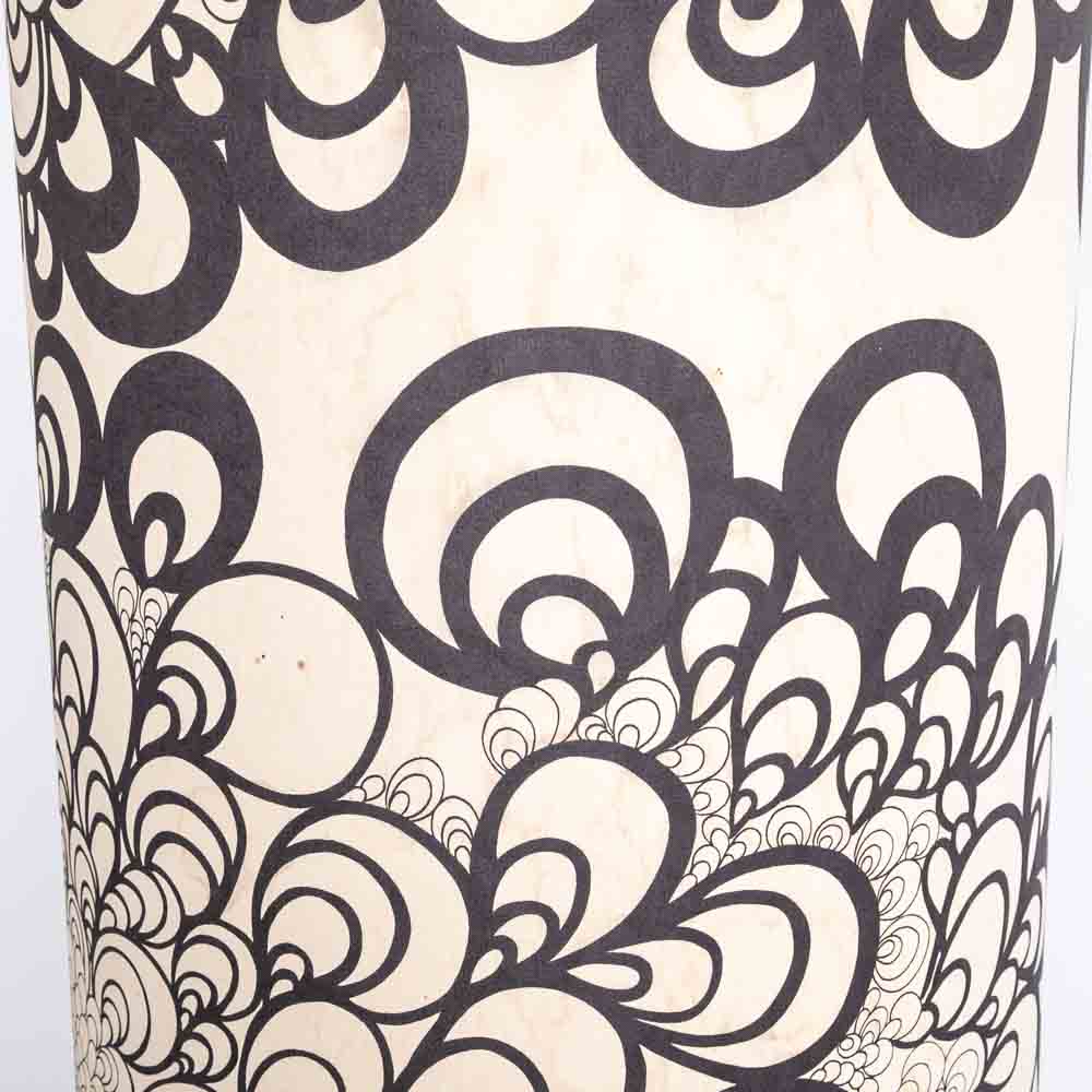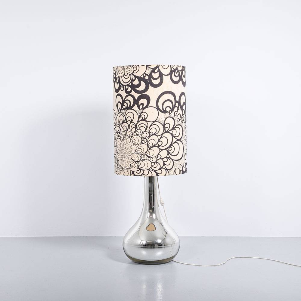 Bodenlampe mit verspiegeltem Fuss, Kunststoffschirm mit gemustertem Stoff bezogen. Flecken am Lampenschirm.
