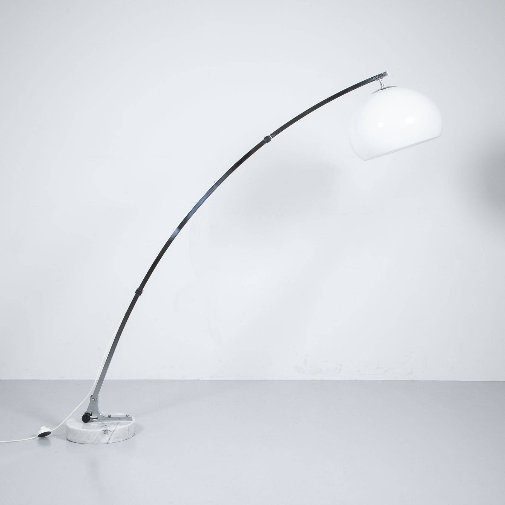 Bogen Stehlampe mit Marmorfuss. Ausziehbarer Arm aus verchromtem Stahl, Lampenschirm aus weissem Kunststoff. Guter Zustand.