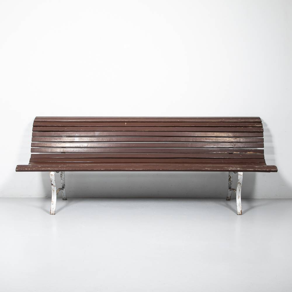 Braune Gartenbank. Hellgrau lackiertes Metallgestell mit Patina, Latten aus massivem, lackiertem Holz. Mit Gebrauchsspuren.