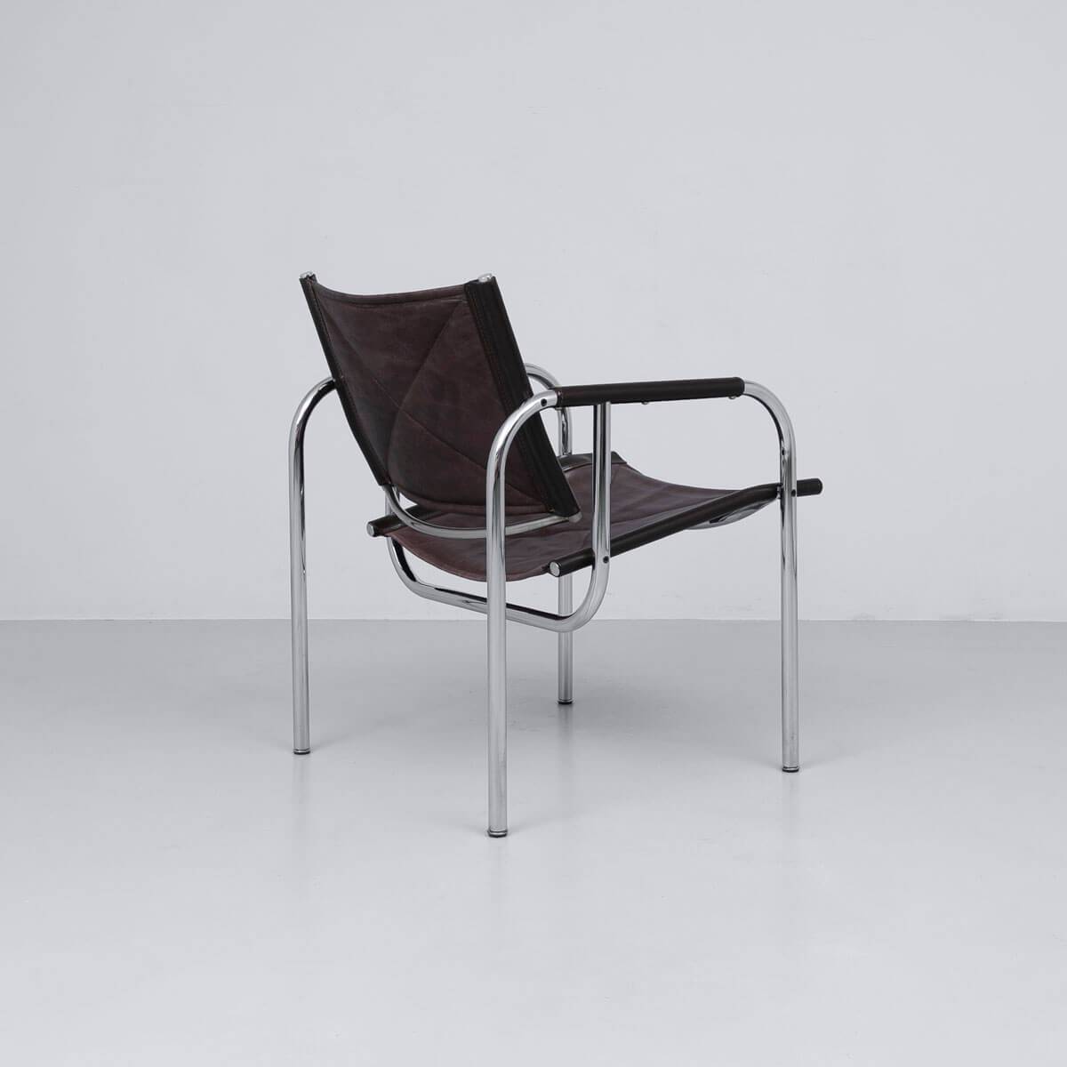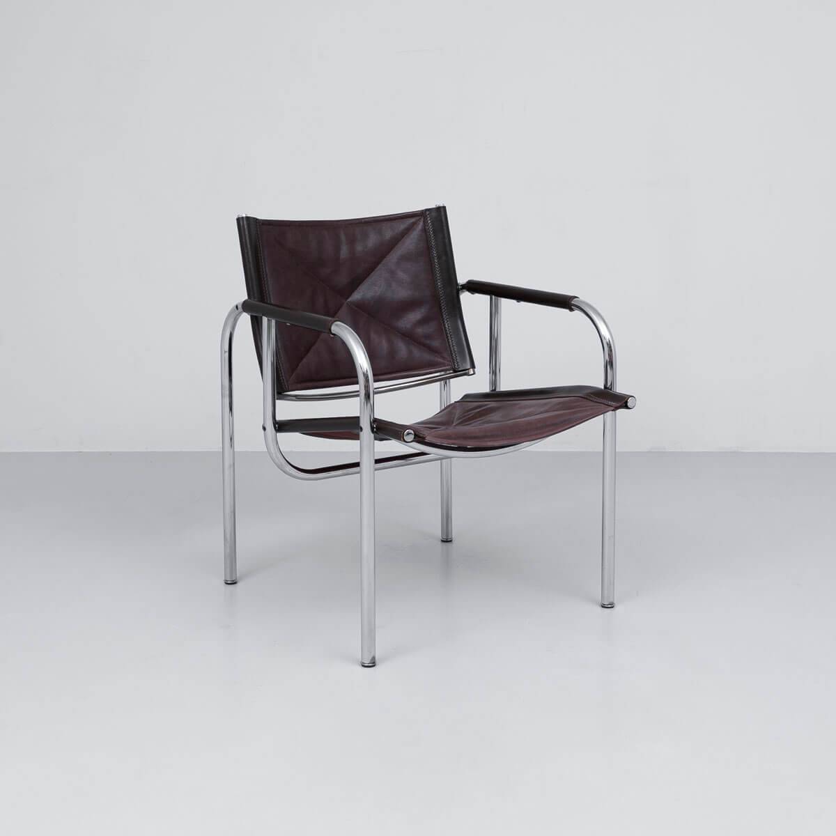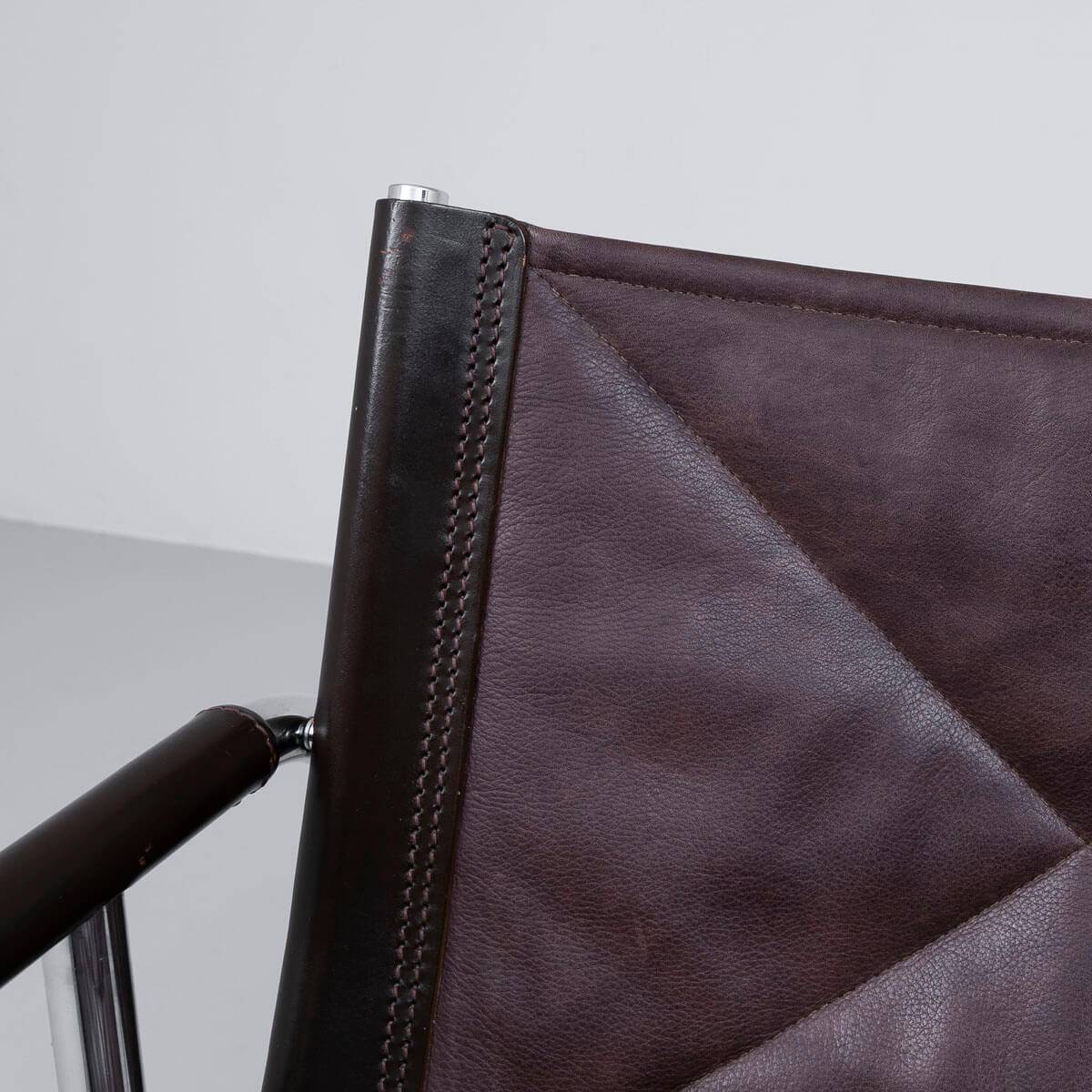 Brauner Eichenberger Sessel, produziert von Strässle. Gestell aus verchromtem Stahl, Sitzfläche und Armlehnen mit braunem Leder bespannt. Bewegliche Rückenlehne. Mit Gebrauchsspuren am Leder.