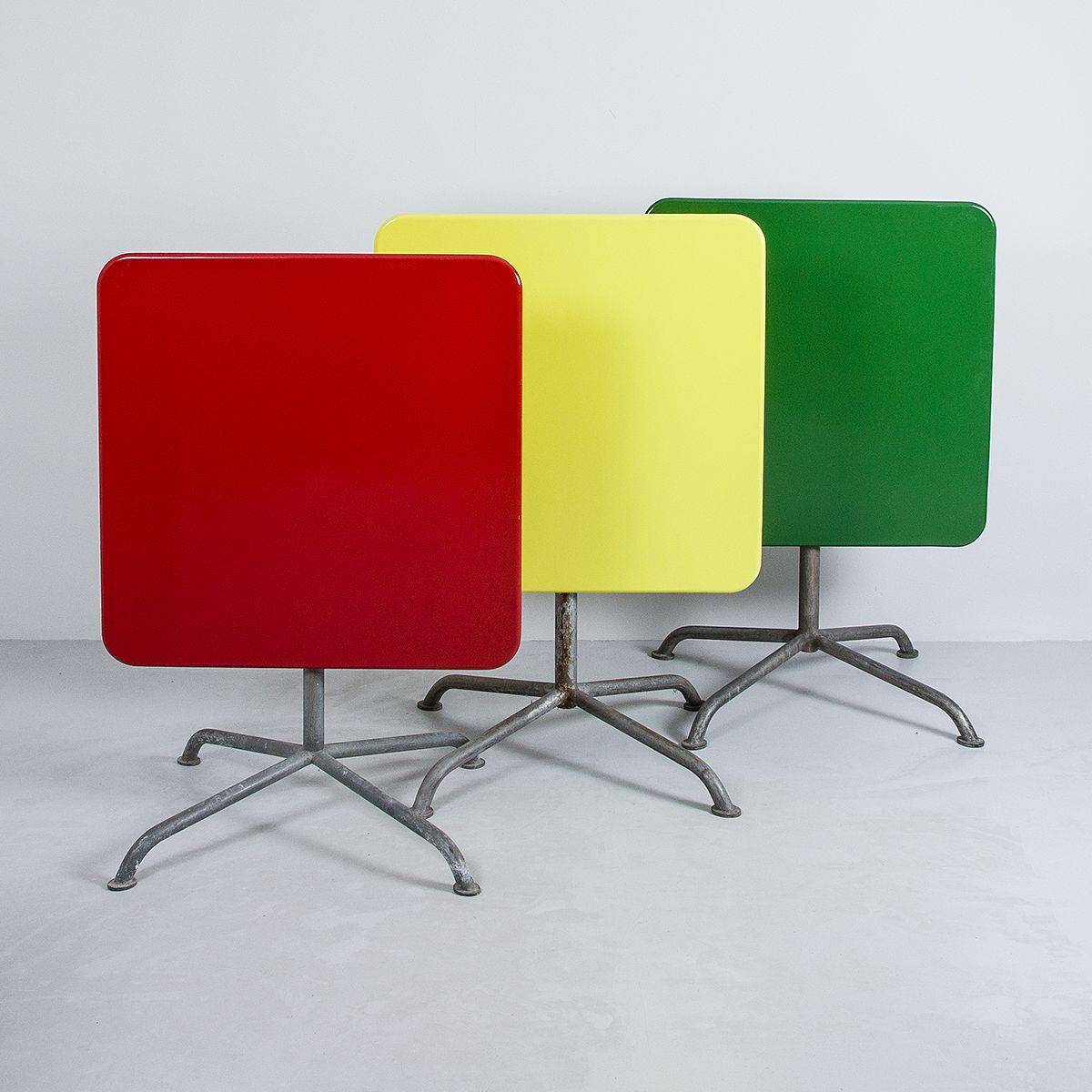 Brauner Gartentisch mit runder Klappplatte. Feuerverzinktes Stahlrohrgestell mit Patina, Platte metallicbraun lackiert mit Dellen und Lackschäden.