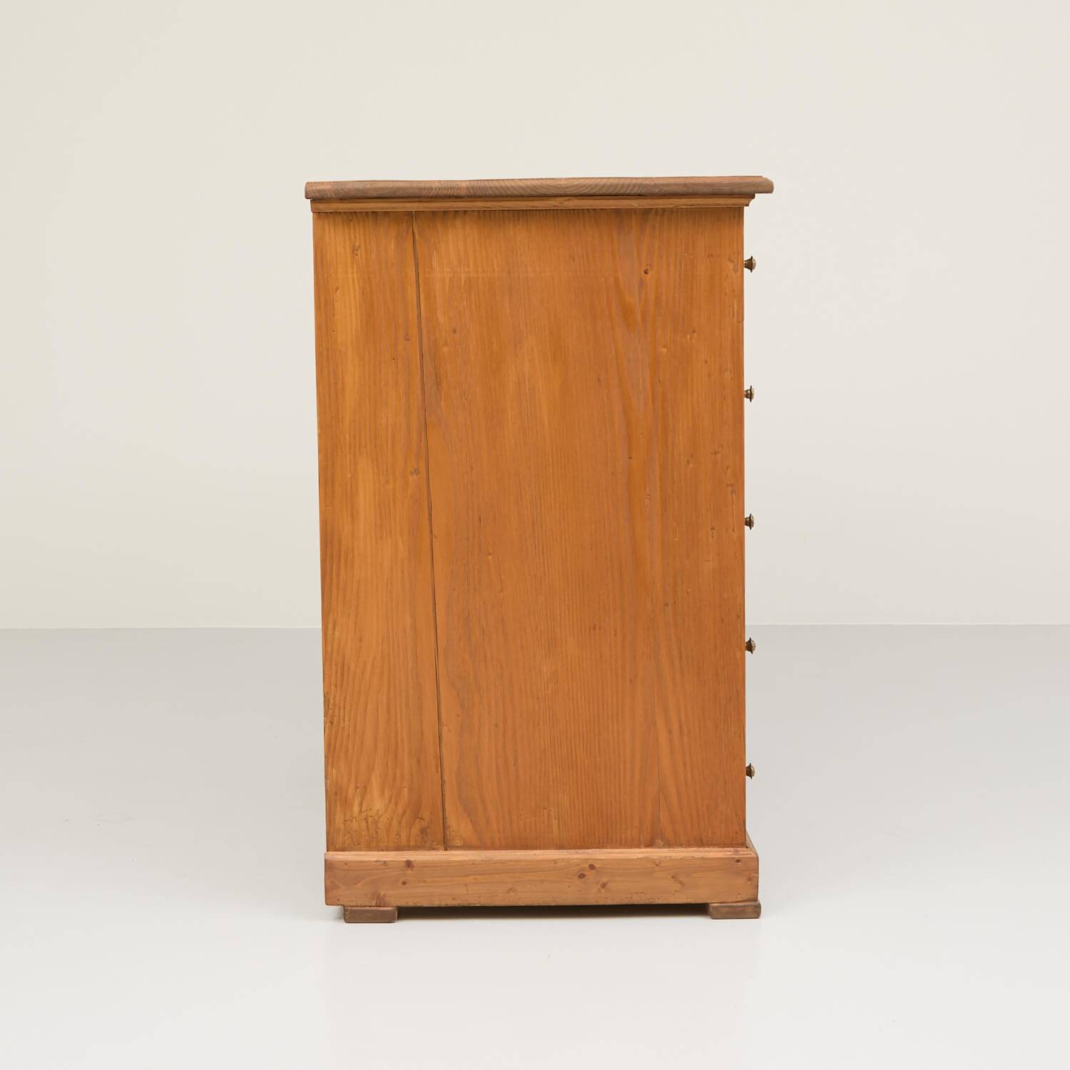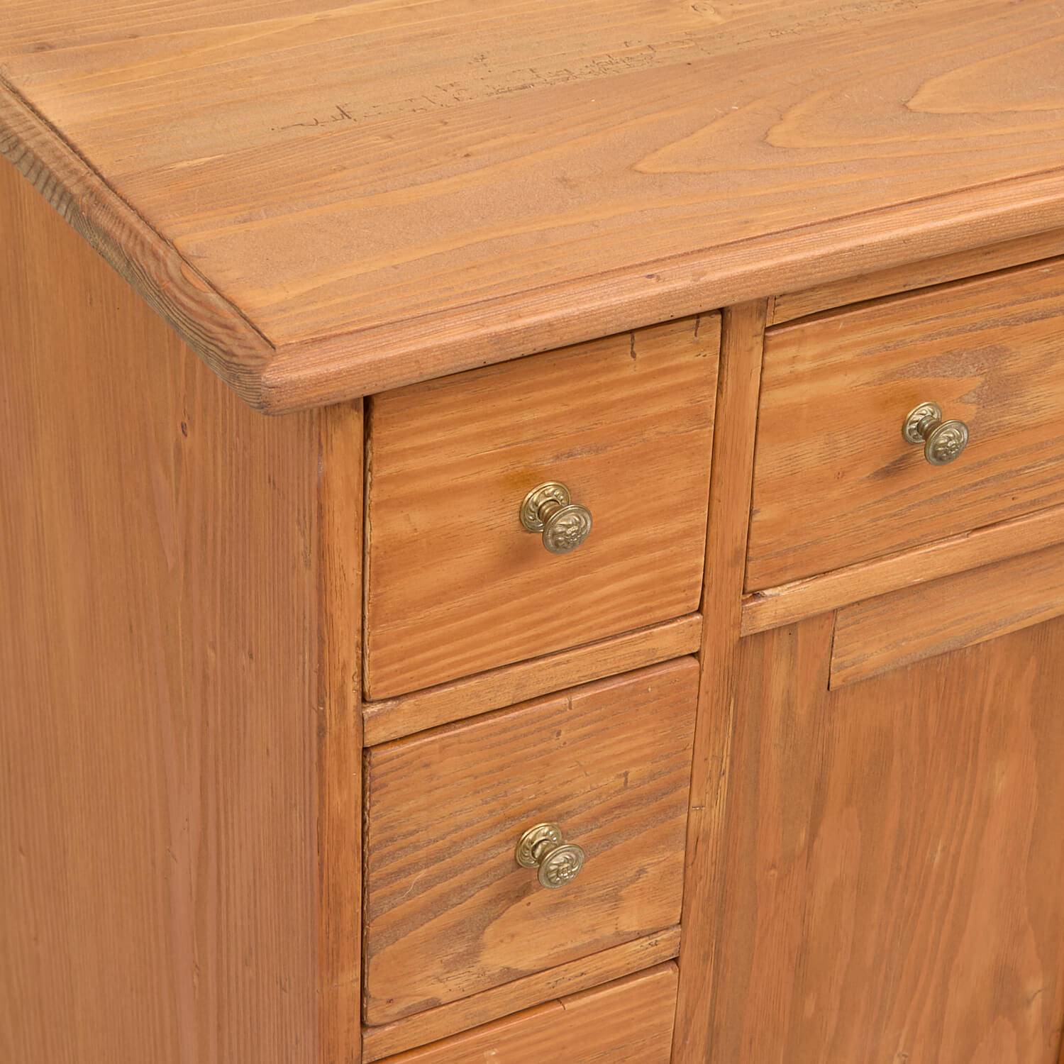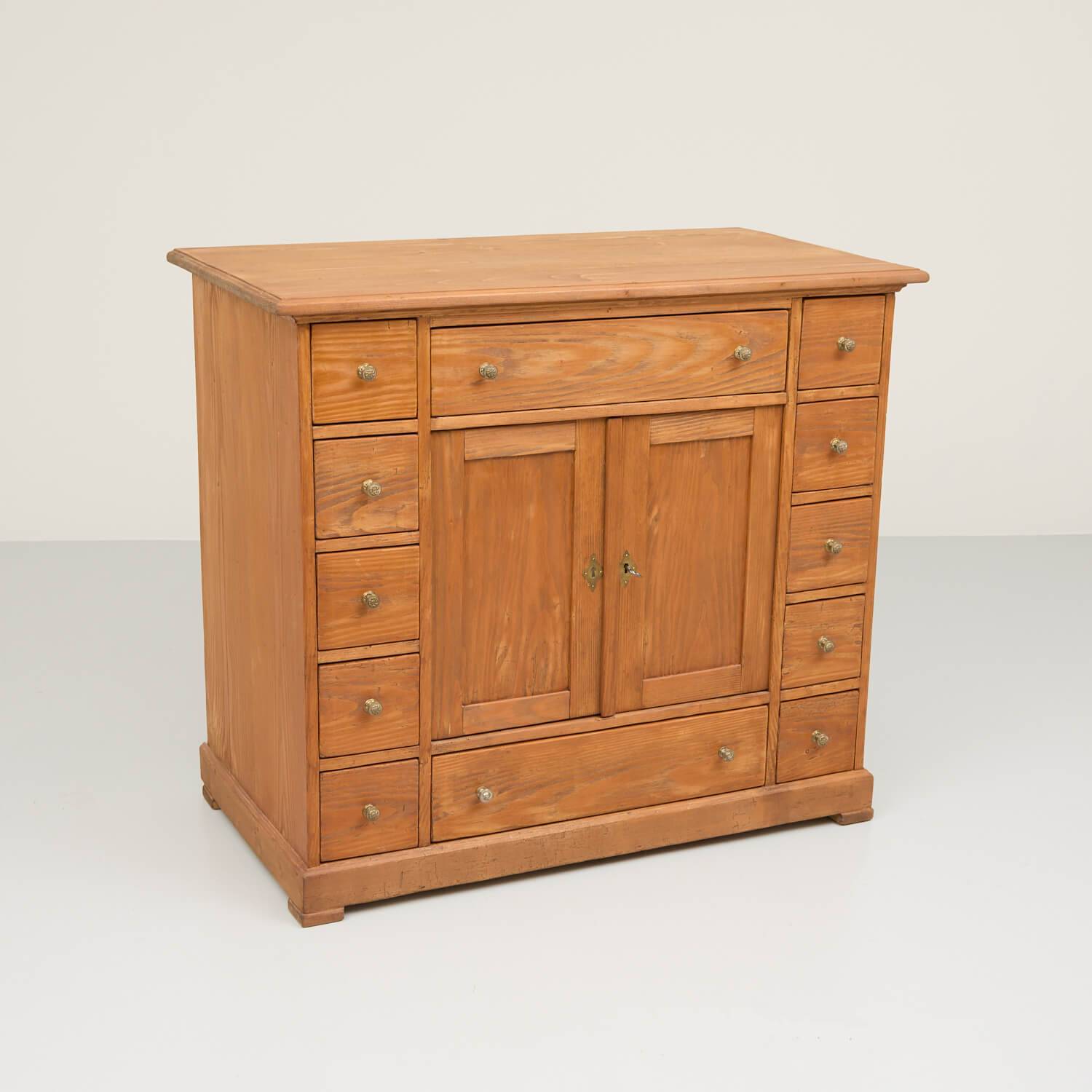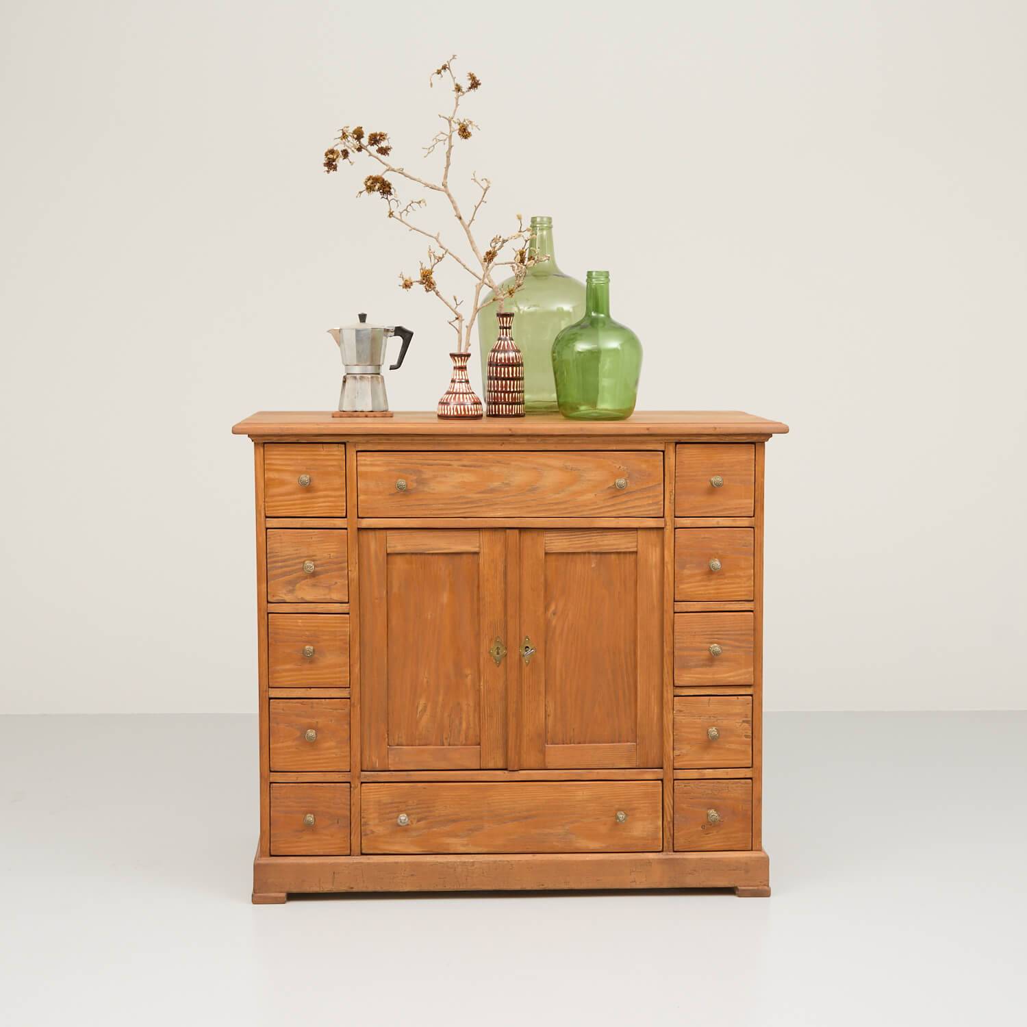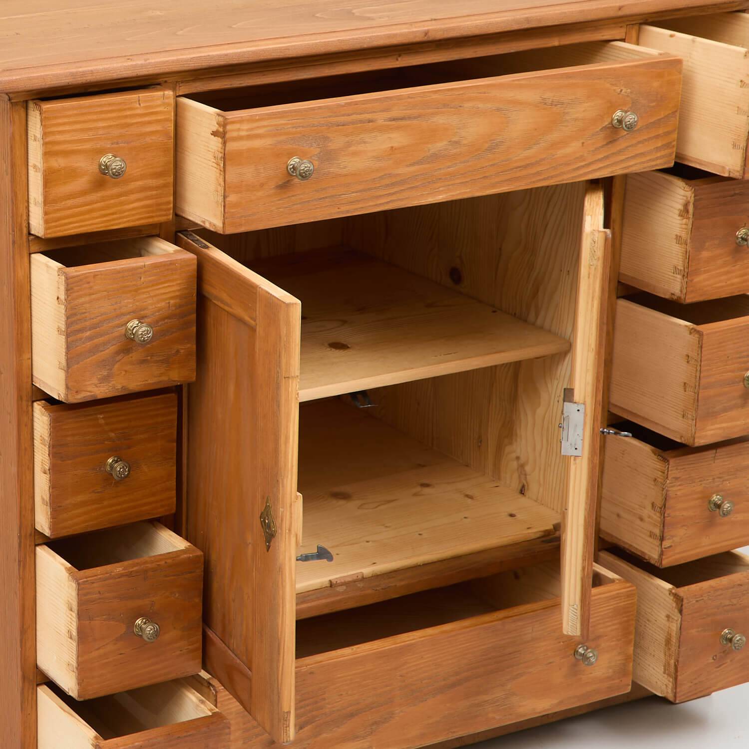 Rustikales Büffet ausTannenholz mit 12 Schubladen. 10 kleine Schubladen sowie zwei breite mit Messinggriffen. Ein abschliessbarer Schrankteil in der Mitte mit einem Tablar. Leichte Gebrauchsspuren sowei schöne Patina. Guter Zustand.