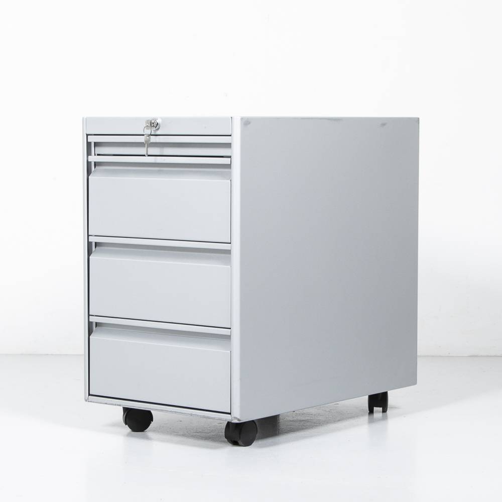 Büro Rollcontainer aus hellgrau lackiertem Stahl, auf Kunststoffrollen. Drei abschliessbare Schubladen, ein Stiftfach. Mit altersbedingten Gebrauchsspuren.