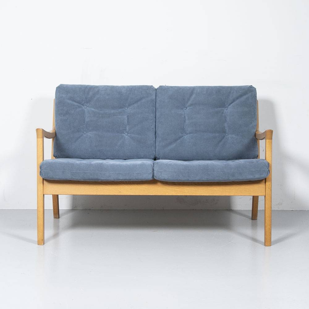 Cado Zweisitzer Hellblau. Modell Senator, in den 1950er entworfen von Ole Wanscher. Gestell aus massiver, lackierter Eiche, Polster bezogen mit hellblauem Wildleder. Guter Zustand.