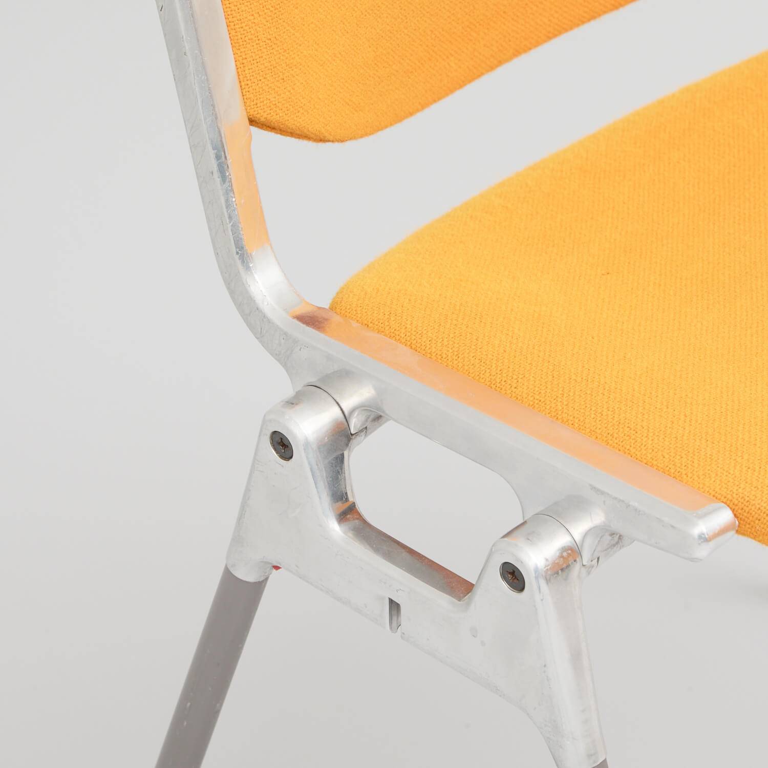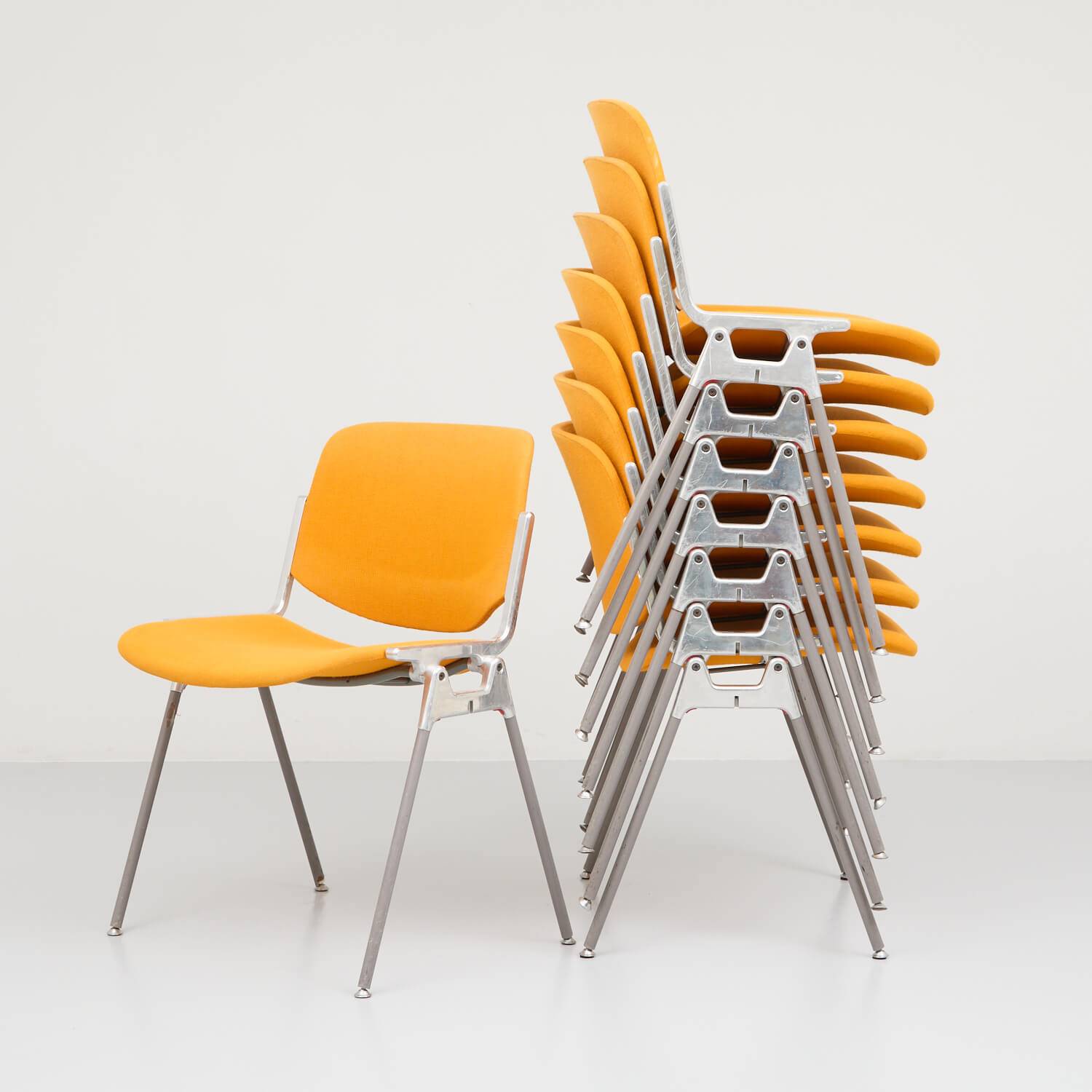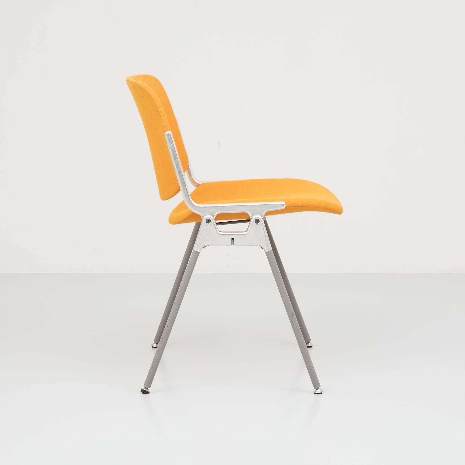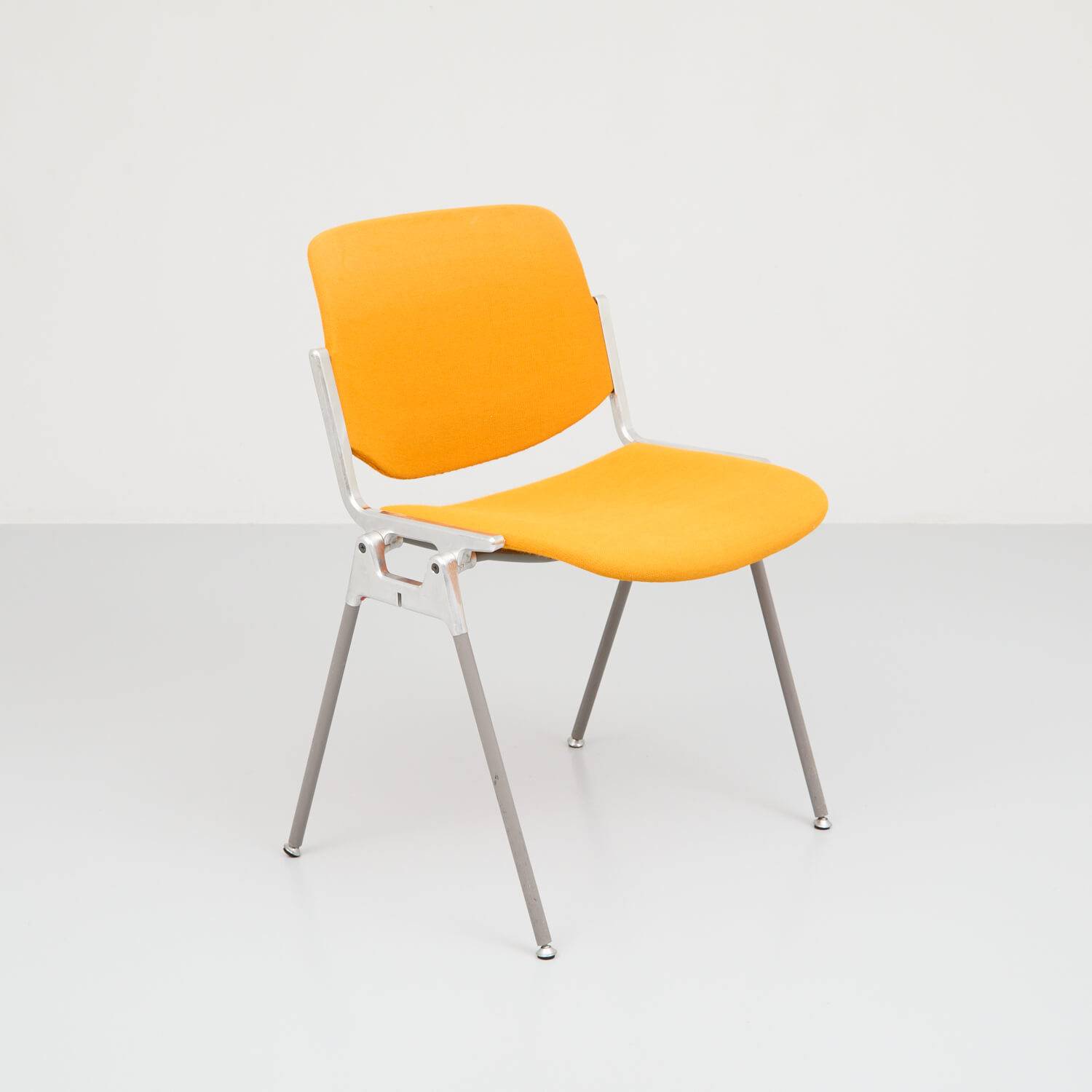 Castelli Stapelstuhl orange. Der Stuhl wurde 1960 von Giancarlo Pretti entworfen. Stapelbares Stahlgestell mit gepolsterte Sitzschale in orangem Stoff. Die Polster wurden mit Dampf gereinigt. Gestell und teilweilse Polster mit Gebrauchsspuren.