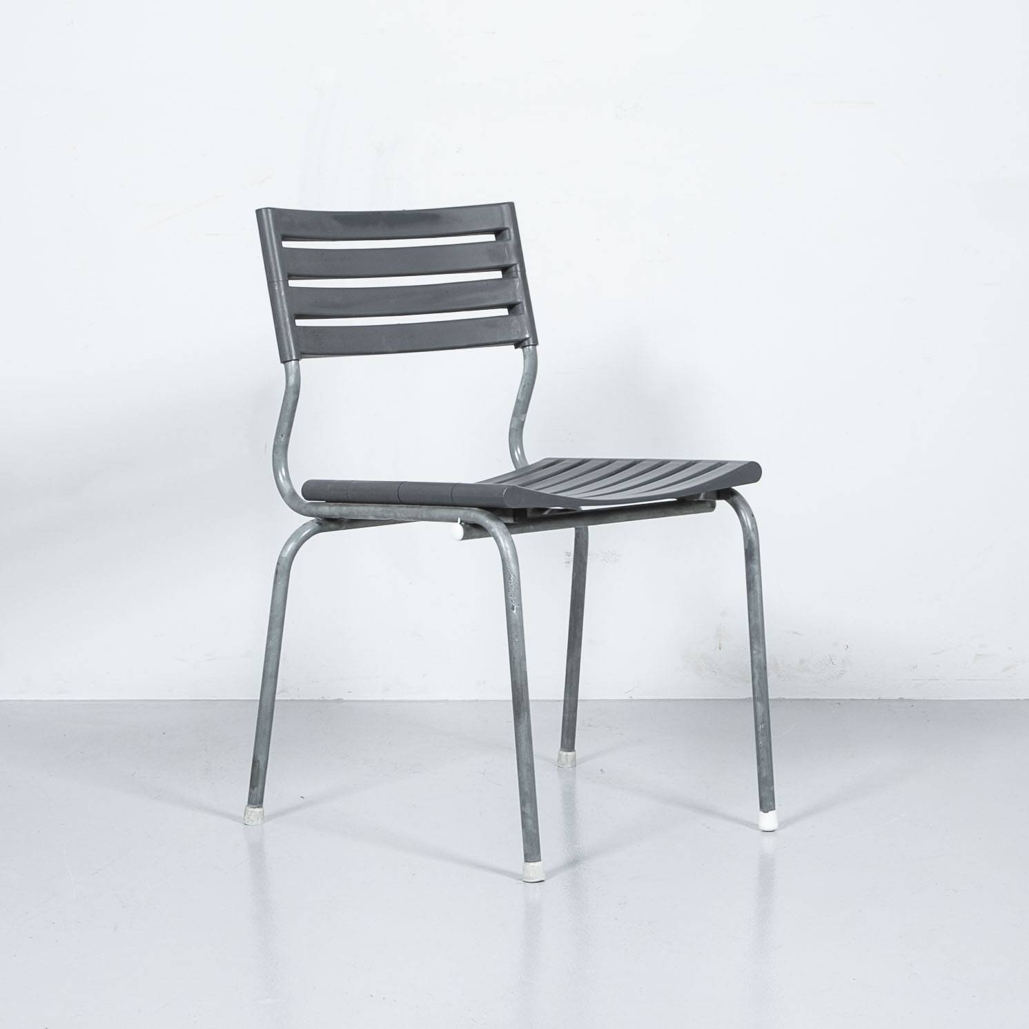 Classic Gartenstuhl von Moobel. Stapelbares Getsell aus verzinktem Stahl, Sitzfläche und Rückenlehne aus grauem Kunststoff. 1967 von Walter Brand entworfen. Mit Gebrauchsspuren. Preis pro Stück.