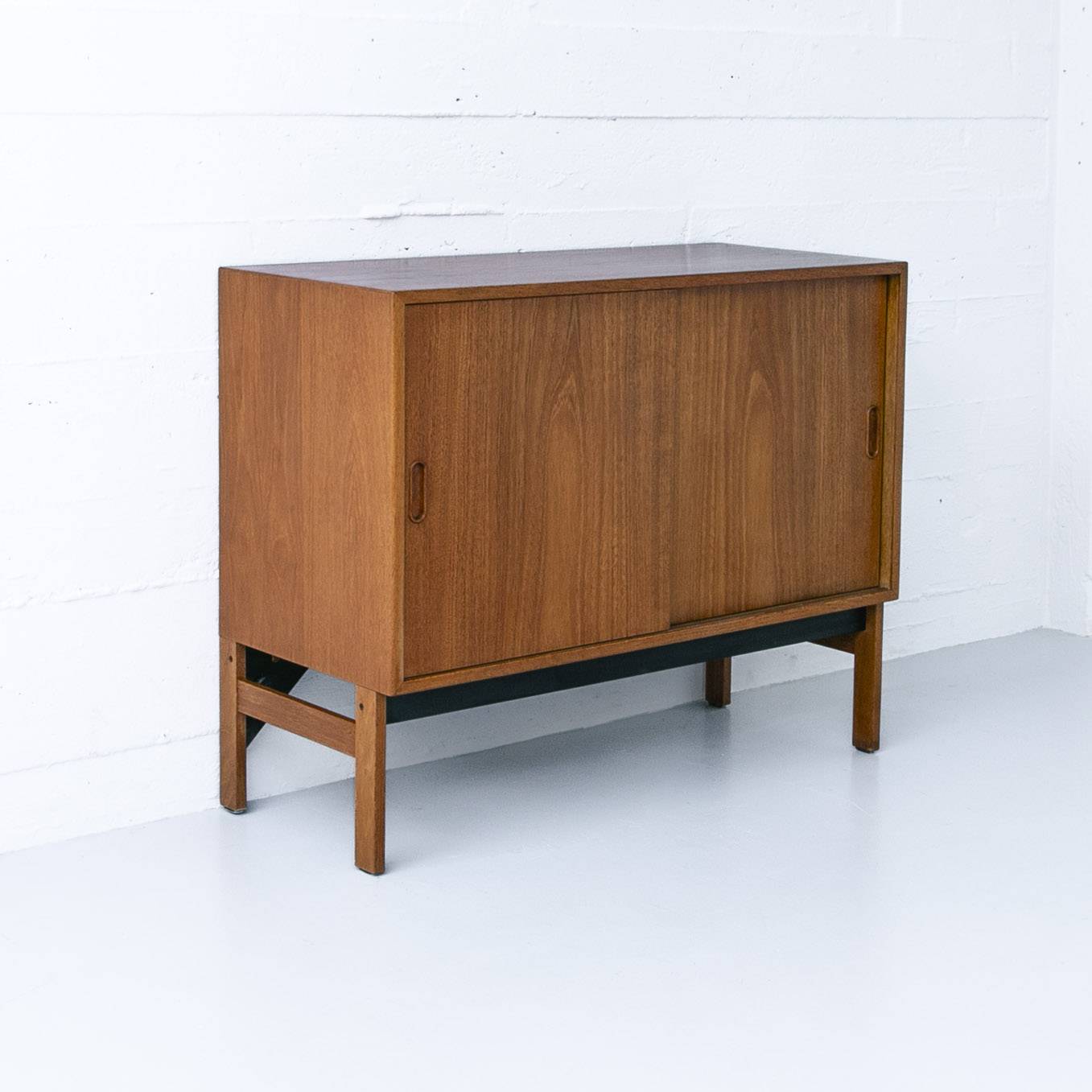 Dänische Teak Schiebetürkommode. Beine aus massivem Teakholz, Korpus, Fronten und Ablage aus Holzwerkstoff mit Furnier in Teakholz. Innen zwei höhenverstellbare Tablare. Guter Zustand.