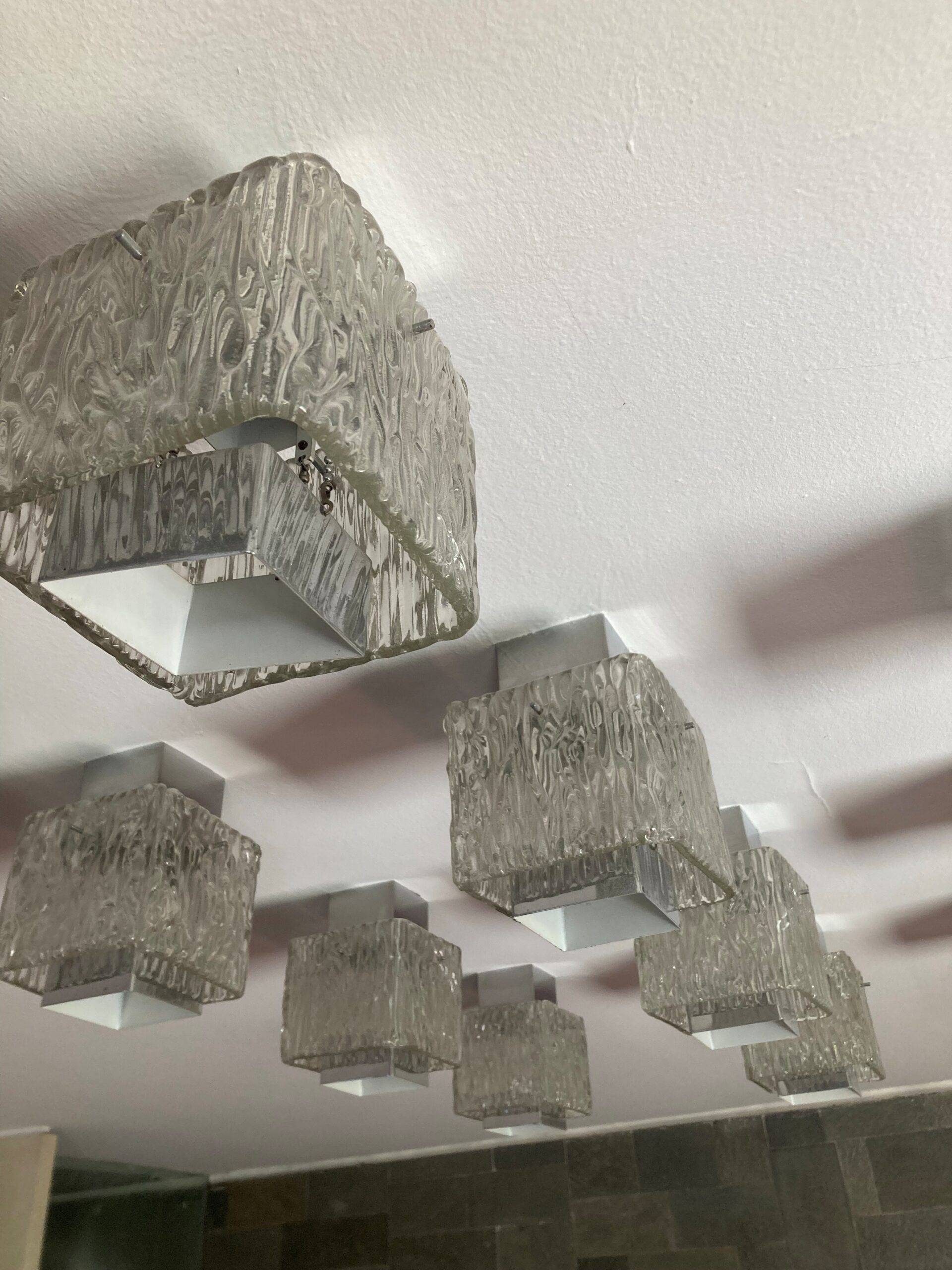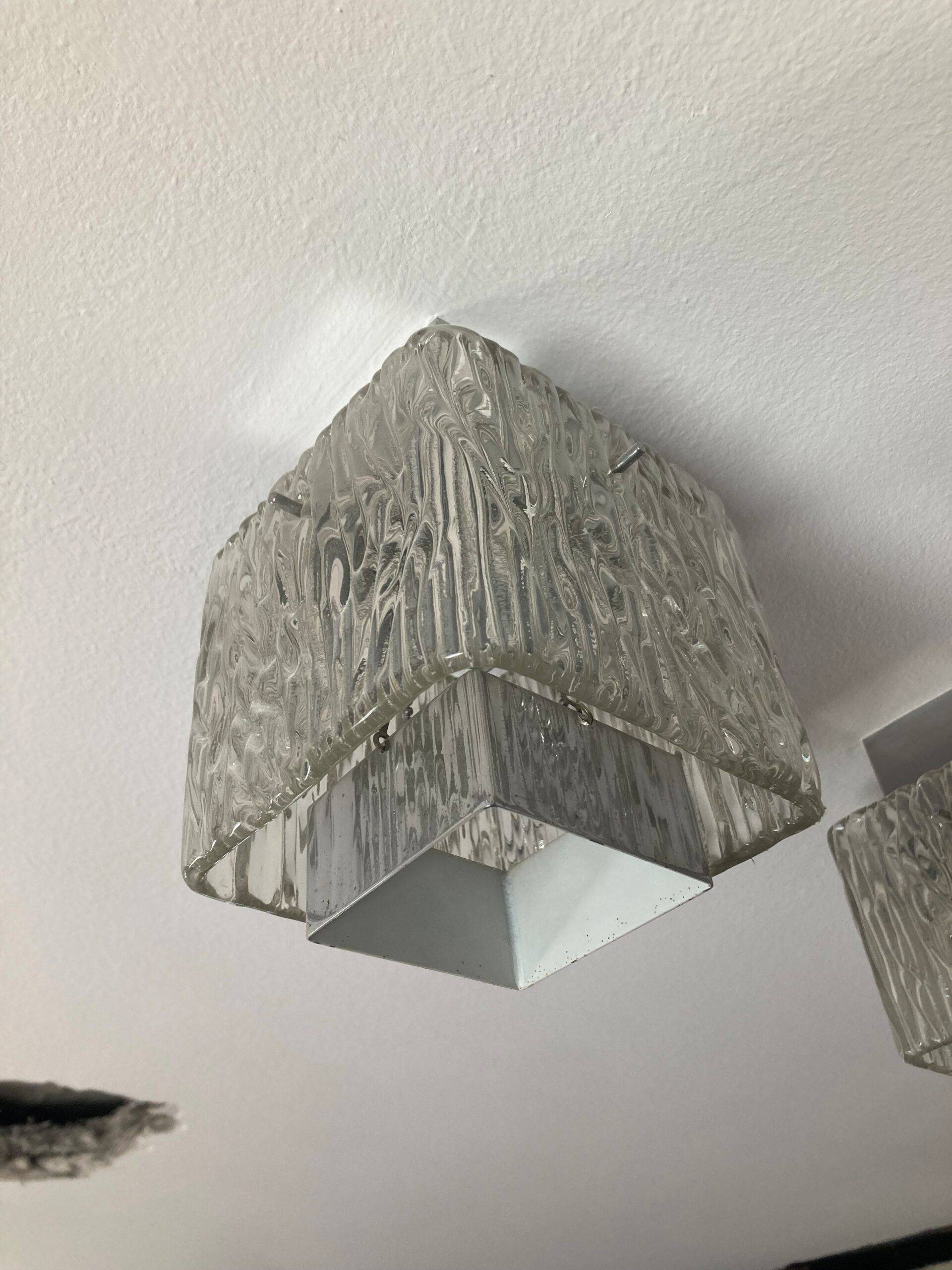 Deckenlampe Glaskubus. Baldachin aus verchromtem Stahl, Schirm aus strukturiertem Klarglas. Mit leichten Gebrauchsspuren.