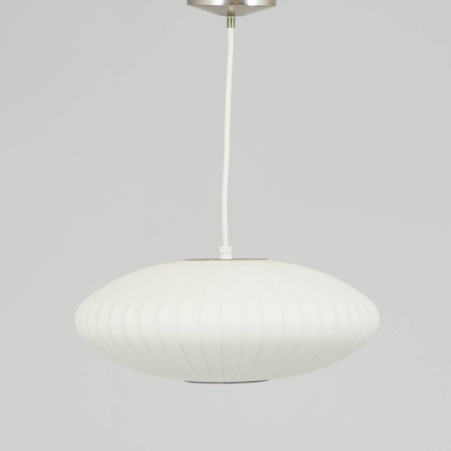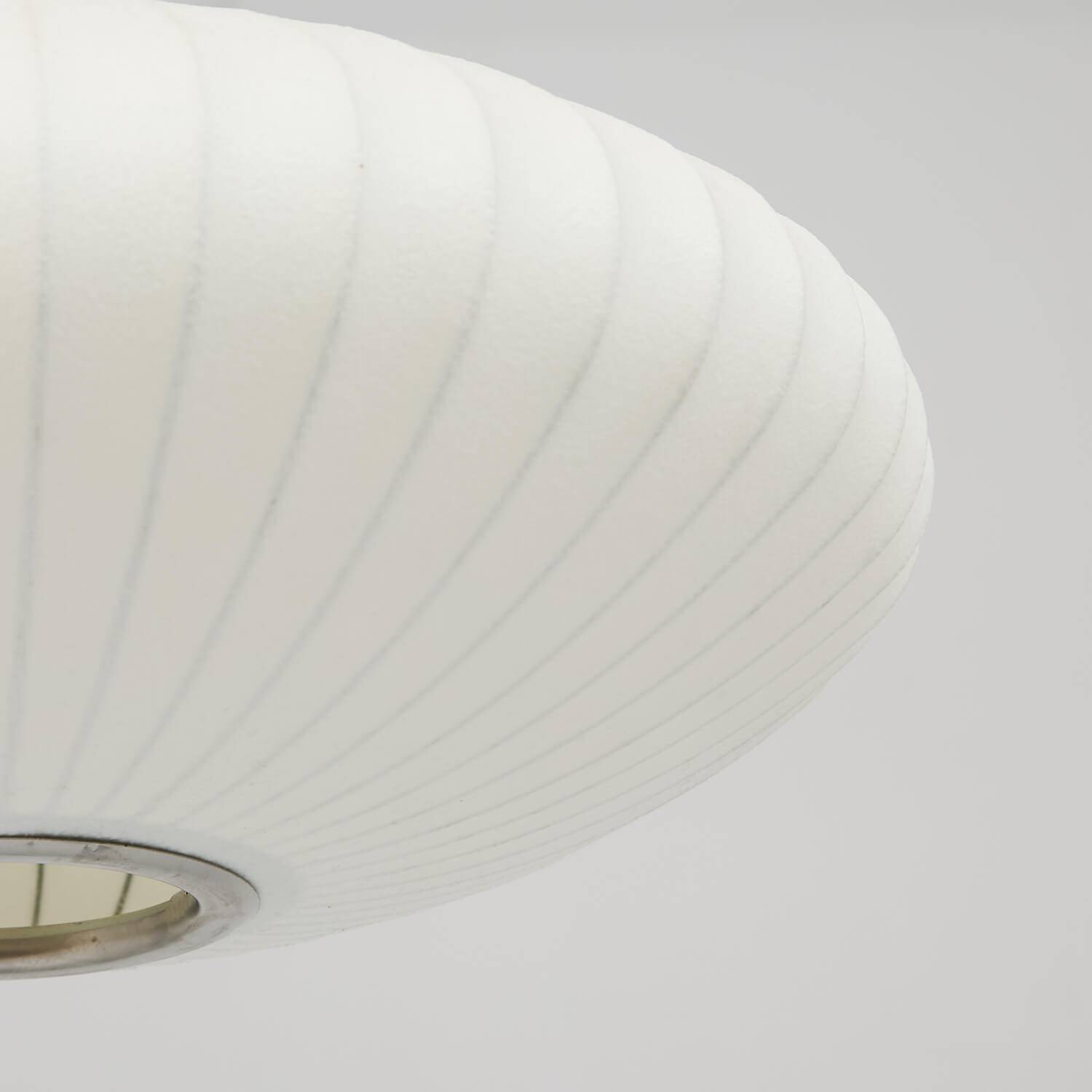 Deckenleuchte Bubble von George Nelson. Die Lampe wurde aus einem Stahlskelett gefertigt und mit Plastikpolymer besprüht. Daraus ergibt sich eine gleichmäßige, organisch anmutende Membran, die ruhiges und diffuses Licht abgibt. Teiweise mit kleinen Dellen und leichten Gebrauchsspuren.