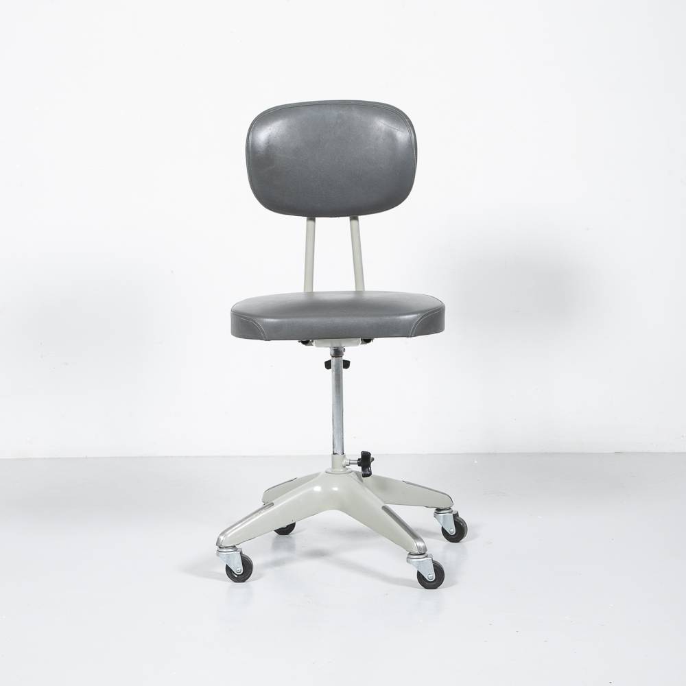 Drehstuhl von Takashi Okamura aus den 1970er. Lackiertes Metallgestell mit Viersternfuss auf Rollen, Sitzfläche und Rückenlehne bezogen mit grauem Kunstleder. Mit altersbedingten Gebrauchsspuren.