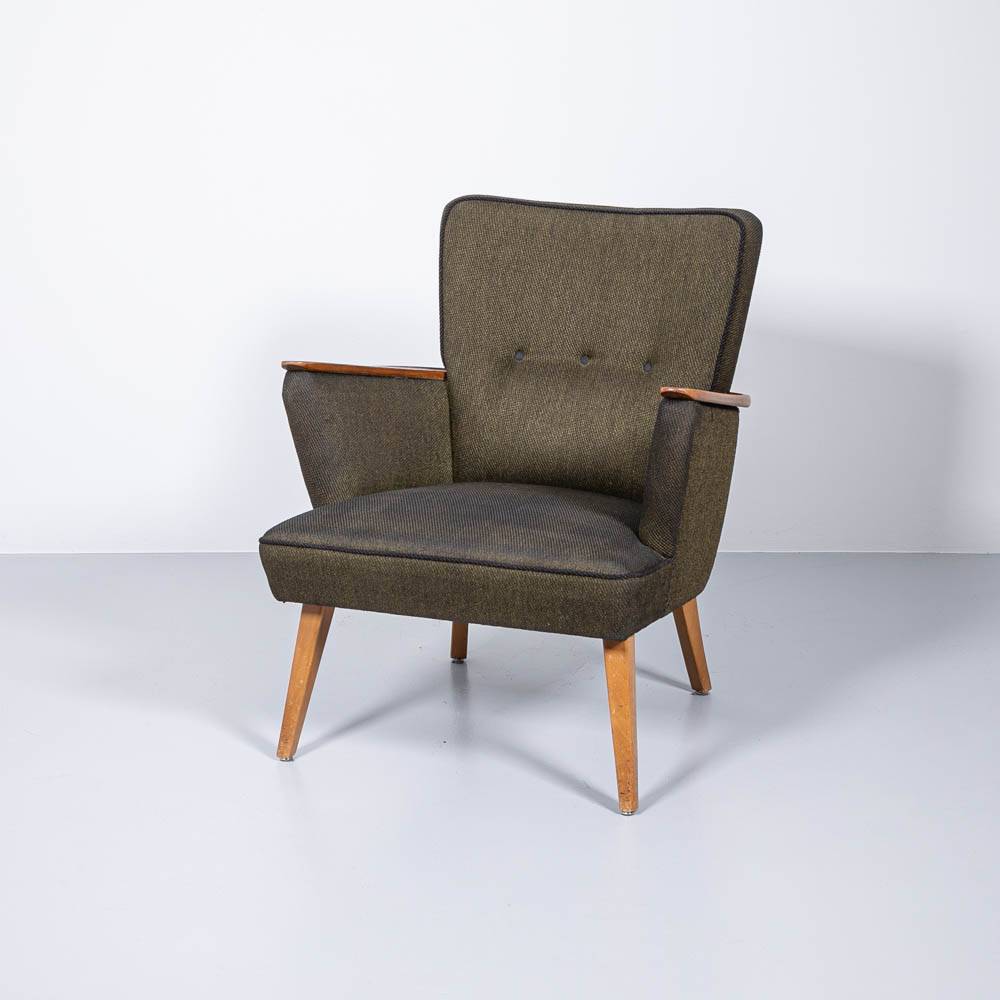 Dunkler Polstersessel aus den 1950er. Beine und Armlehnen aus massivem Nussbaumholz. Polster mit Stoff bezogen, leichte Gebrauchsspuren.