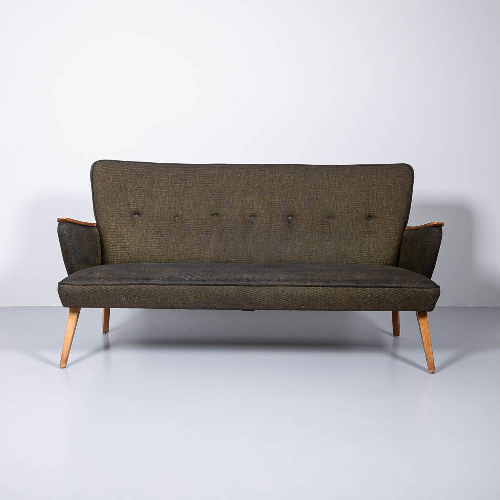 Dunkles Polstersofa aus den 1950er. Beine und Armlehnen aus massivem Nussbaumholz, Polster mit schwarz gelbem Stoff bezogen. Leichte Gebrauchsspuren.