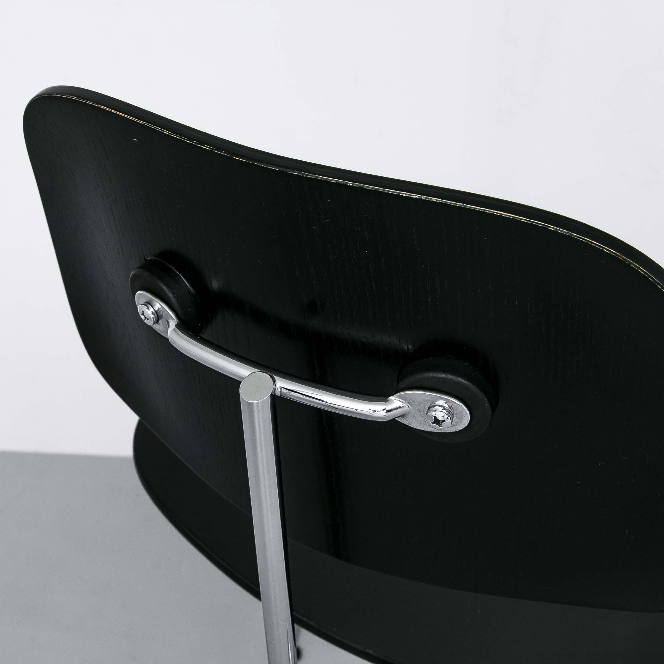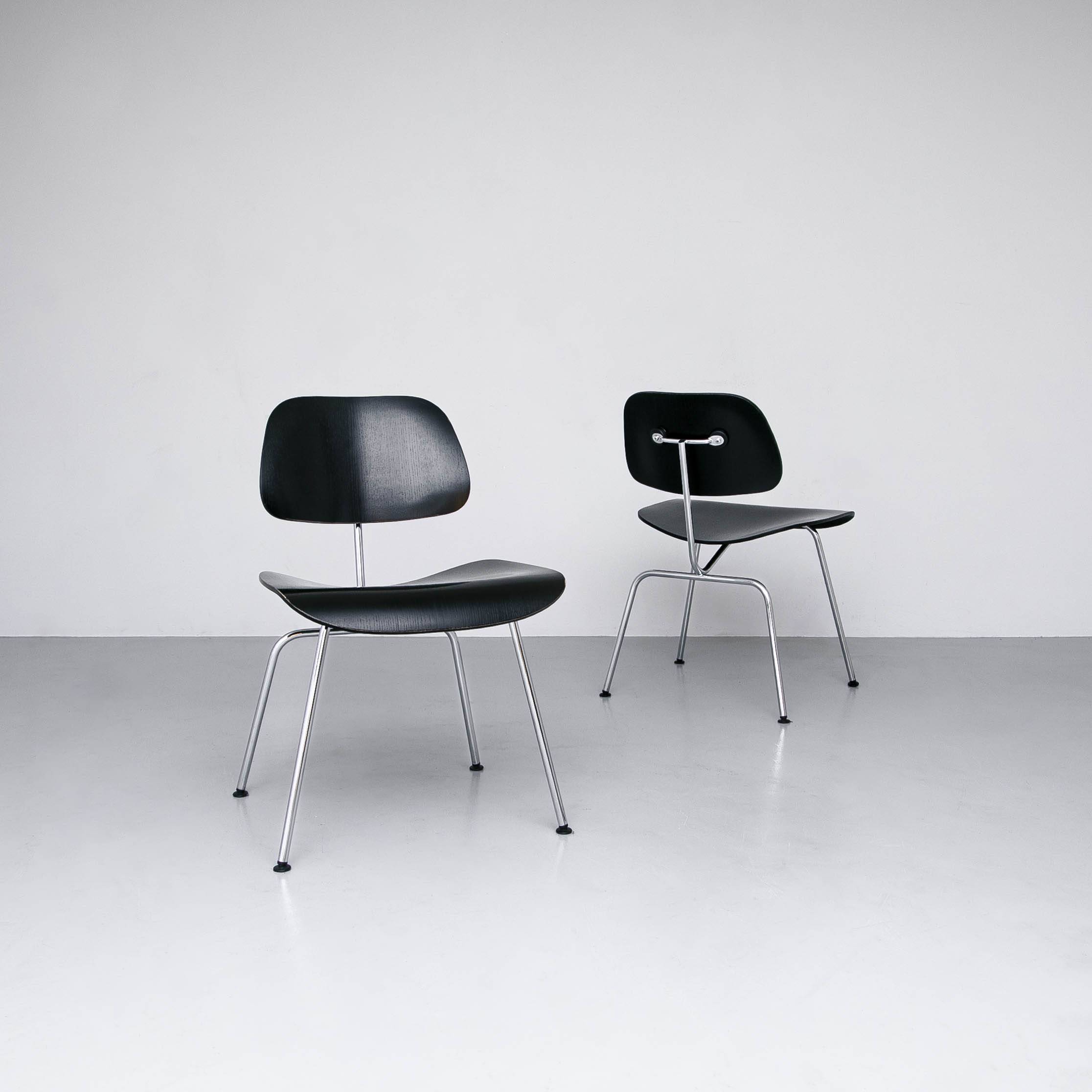 Eames LCM Chair Vitra. Gestell aus verchromtem Stahl, Sitzfläche und Rückenlehne aus Formsperrholz mit lackiertem Eichenfurnier. Leichte Lackschäden an der Sitzfläche und der Rückenlehne. Preis pro Stück.