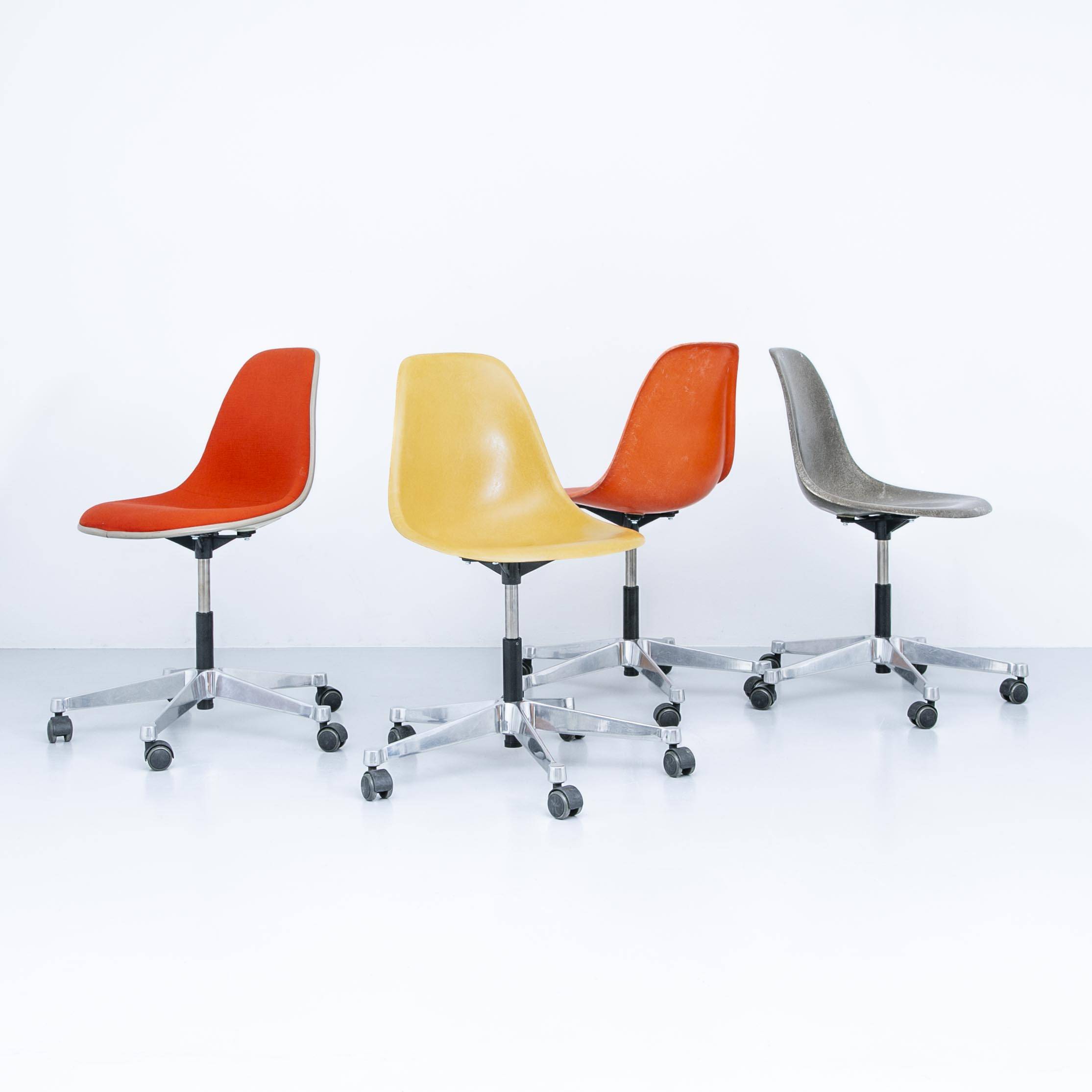 Eames Sidechair auf Rollen. Aluminumfuss auf Kunststoffrollen, höhenverstellbar. Sitzschale aus Fiberglas. Fuss von Vitra, Sitzschale von Herman Miller. Verschiedene Ausführungen. Mit Gebrauchsspuren.