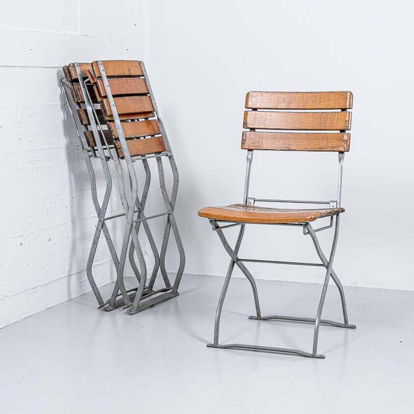 Robuster und klassischer Biergartenstuhl aus lackierten Esche Holzlatten auf feuerverzinktem Metallgestell. Altersbedingte Lack- und Witterungsschäden. Preis pro Stuhl.
