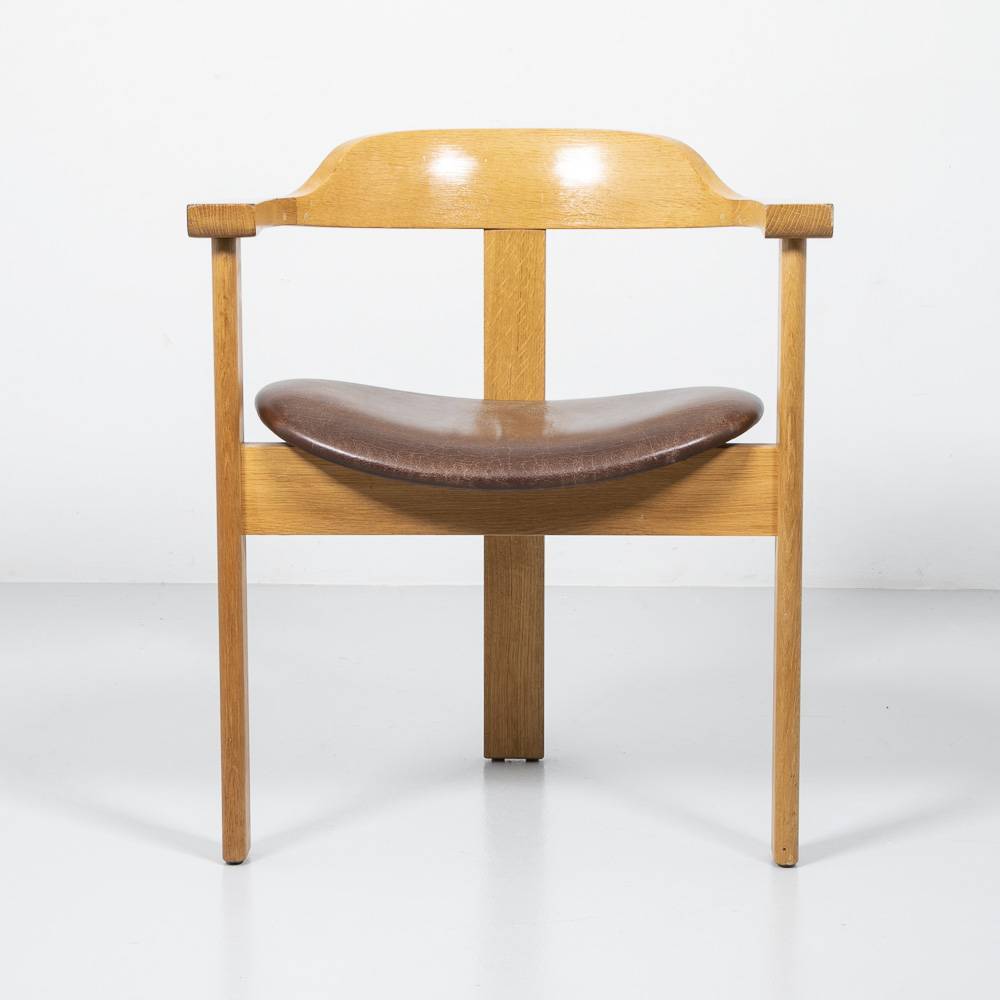 Armlehnstuhl Modell 6120 aus massiver Eiche mit braunem Lederbezug auf der Sitzfläche. In den 1960er von Trix & Robert Haussmann entworfen und von Dietiker produziert. An den Leimstellen beschädigt, siehe letztes Foto.