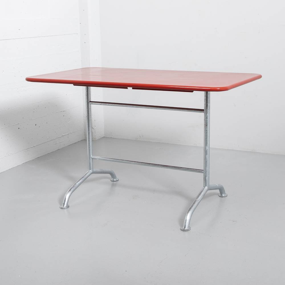Feuerroter Bigla Gartentisch. Der Tisch wurde vollständig restauriert, die Platte in RAL 3000 pulverbeschichtet, das Gestell feuerverzinkt. Kleine Unebenheiten auf der Platte.