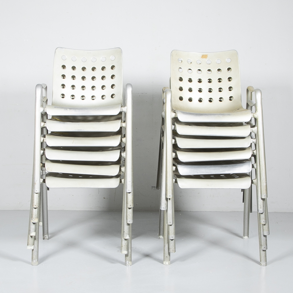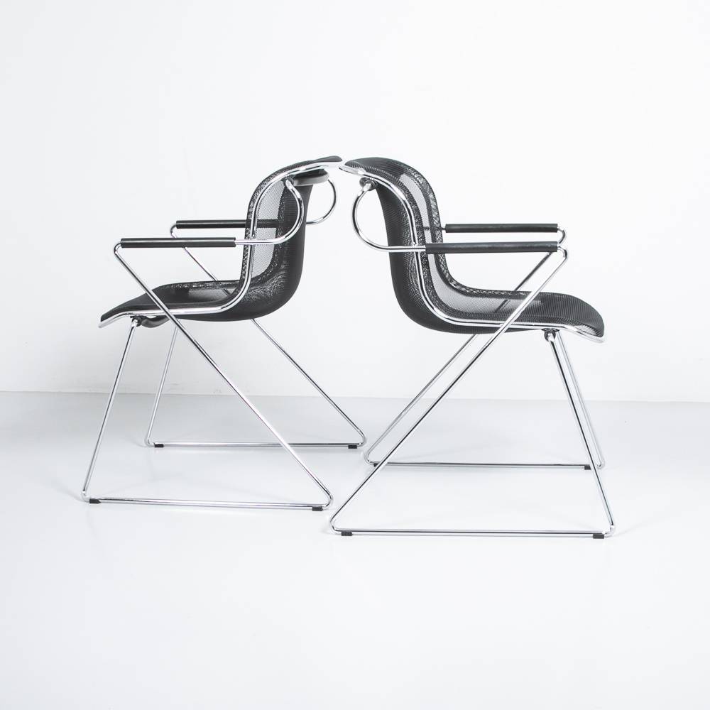 Penelope Freischwinger aus verchromtem Stahlrohr und schwarz beschichtetem Metallgitter, stapelbar. In den 1980er von Charles Pollock entworfen und durch Castelli produziert. Stückpreis.