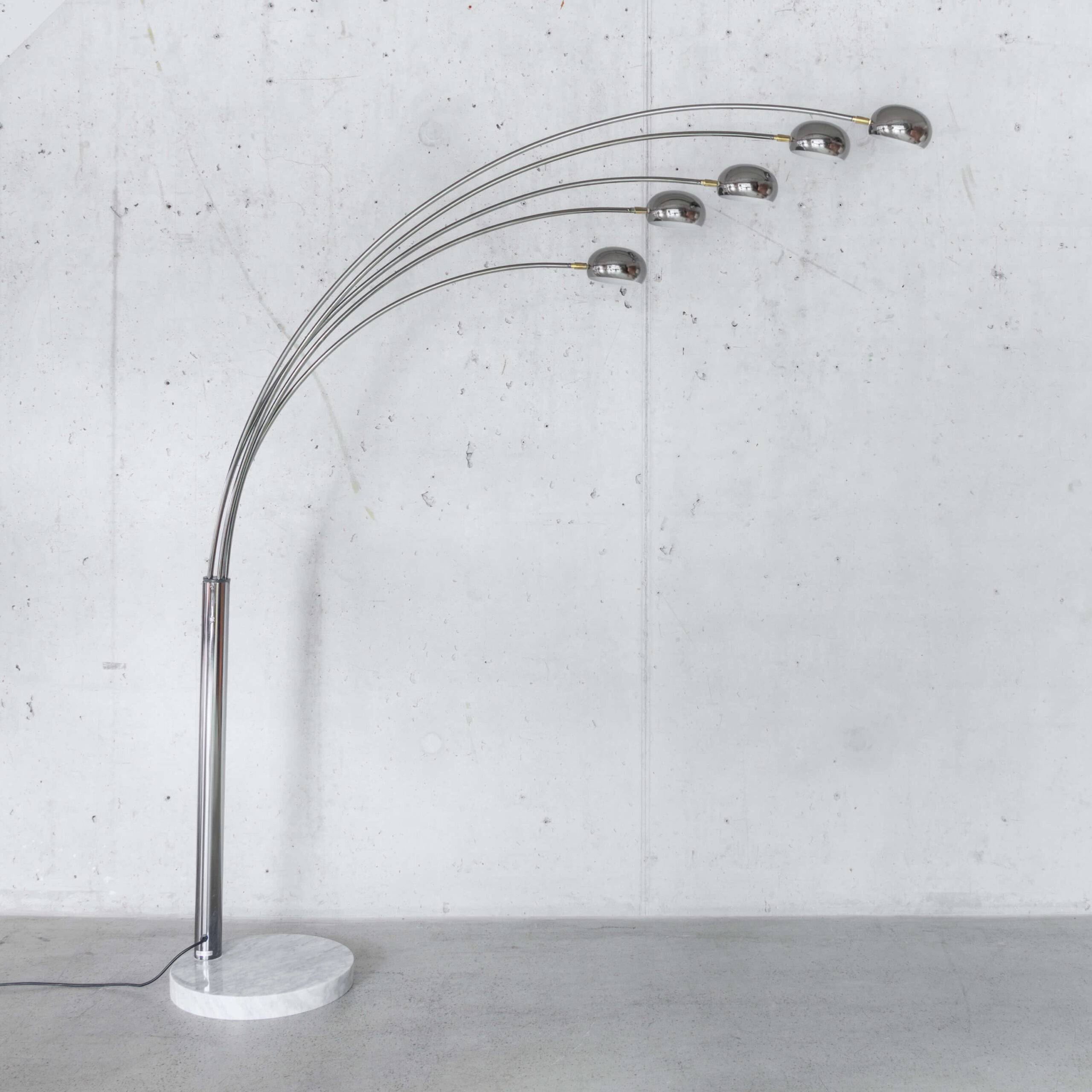 Fünfarmige Stehlampe. Fuss aus hellem Marmor, Arme aus verchromtem Stahl. Mit Gebrauchsspuren.