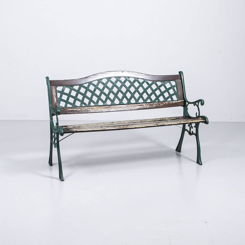 Gartenbank mit Patina aus braun lackiertem Holz und grün lackiertem Gusseisen mit verspielten Flechtdetails. Holz und Gusseisen Lackierung haben Patina durch starke Witterungsspuren.