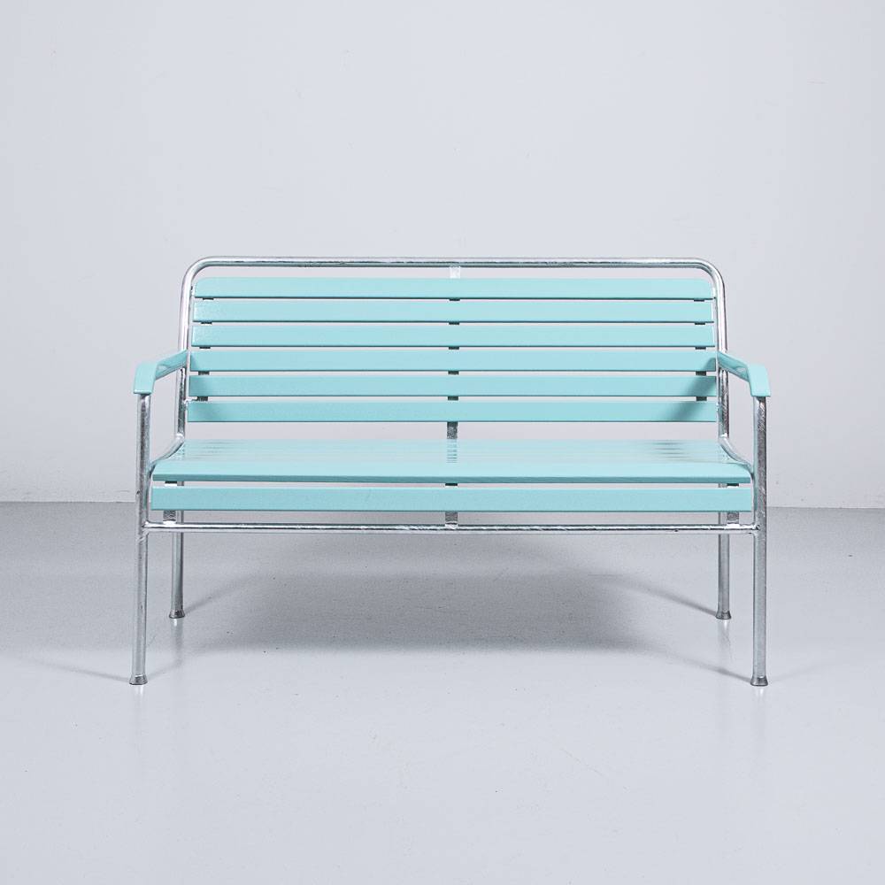 Gartenbank komplett restauriert in der Farbe RAL 6027 lichtgrün. Die Holzlatten sind komplett neu und das Gestell wurde feuerverzinkt.