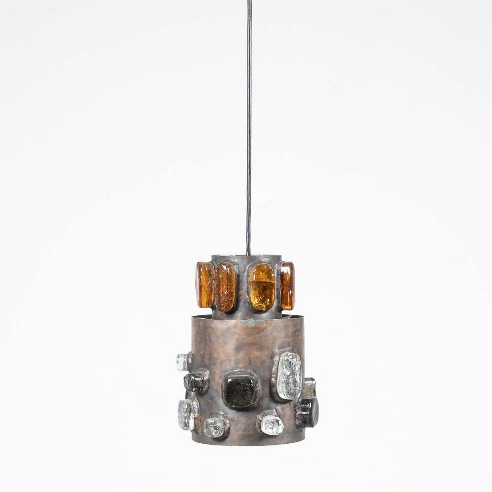 Hängelampe Glas/ Kupfer. Zylindrischer Koprus aus Kupfer mit eingefassten Glaselementen in Klarglas und farbigem Glas. Eine Lampe misst in der Höhe 28 cm, eine 32.5 cm. Mit Patina.