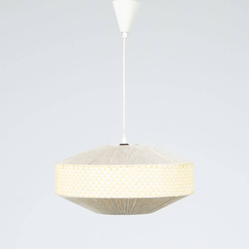 Hängelampe mit gelbem Schirm. Flecken an der Textilbespannung.