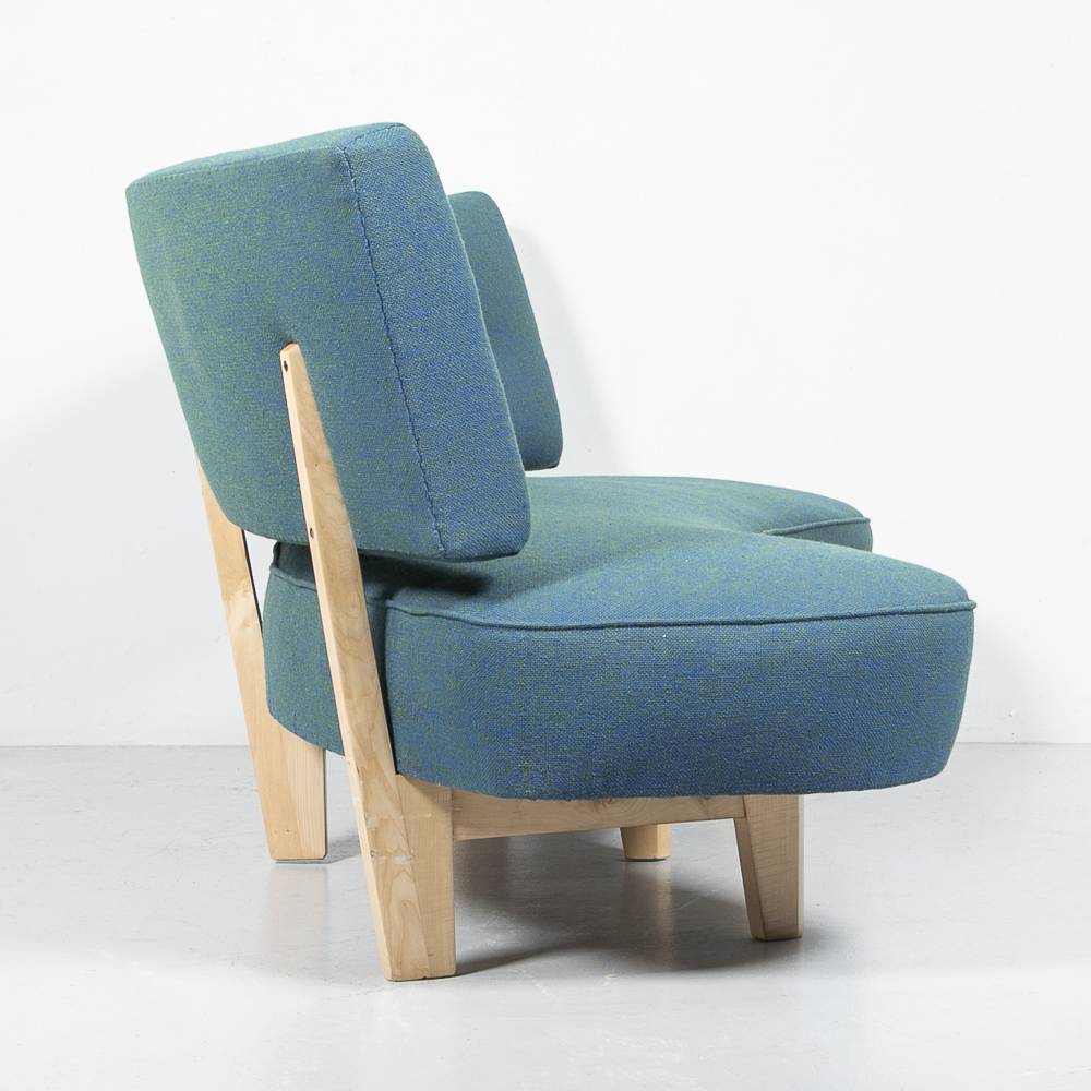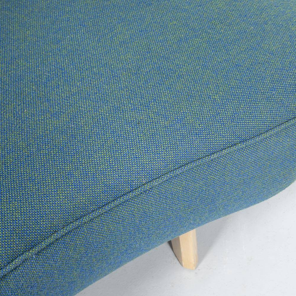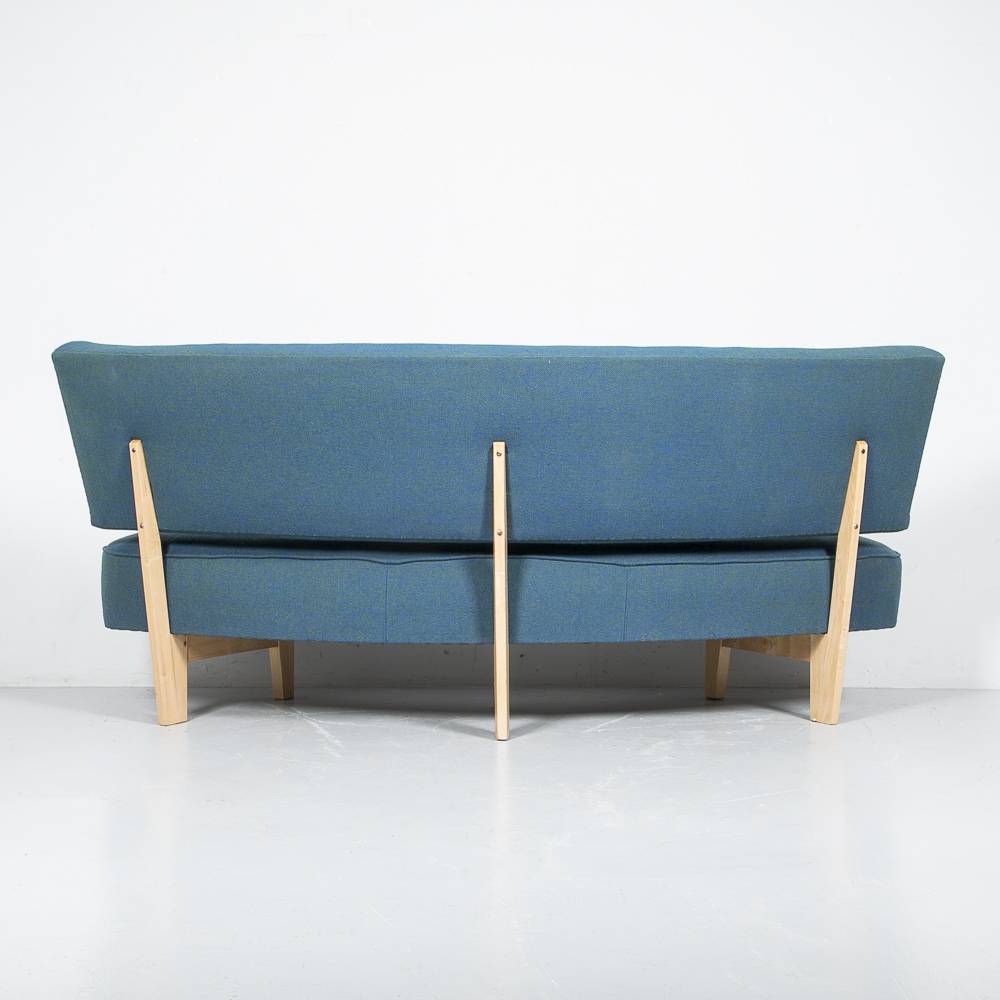 Modell 1270 Stoffsofa von Hans Bellmann, Entwurf 1946. Vertrieb durch Wohnbedarf. Petrol Stoffbezug auf Ahorn Rahmen und Füssen.