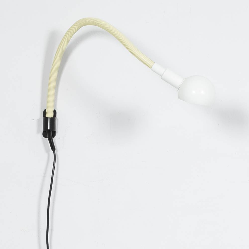 Hebi Lampe weiss, entworfen von Isao Hosoe, produziert durch Valenti Luce. Beweglicher Arm mit Kunststoffverkleidung, Lampenschirm aus weissem Metall, eine Halterung zur Wandmontage, eine Tischklemme aus Kunststoff. Kaum Gebrauchsspuren.