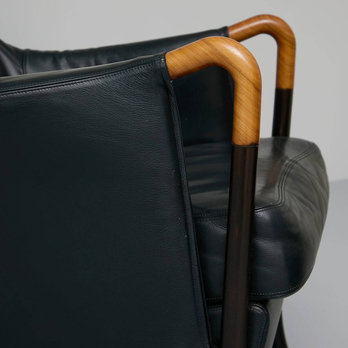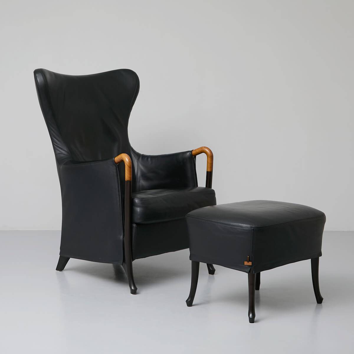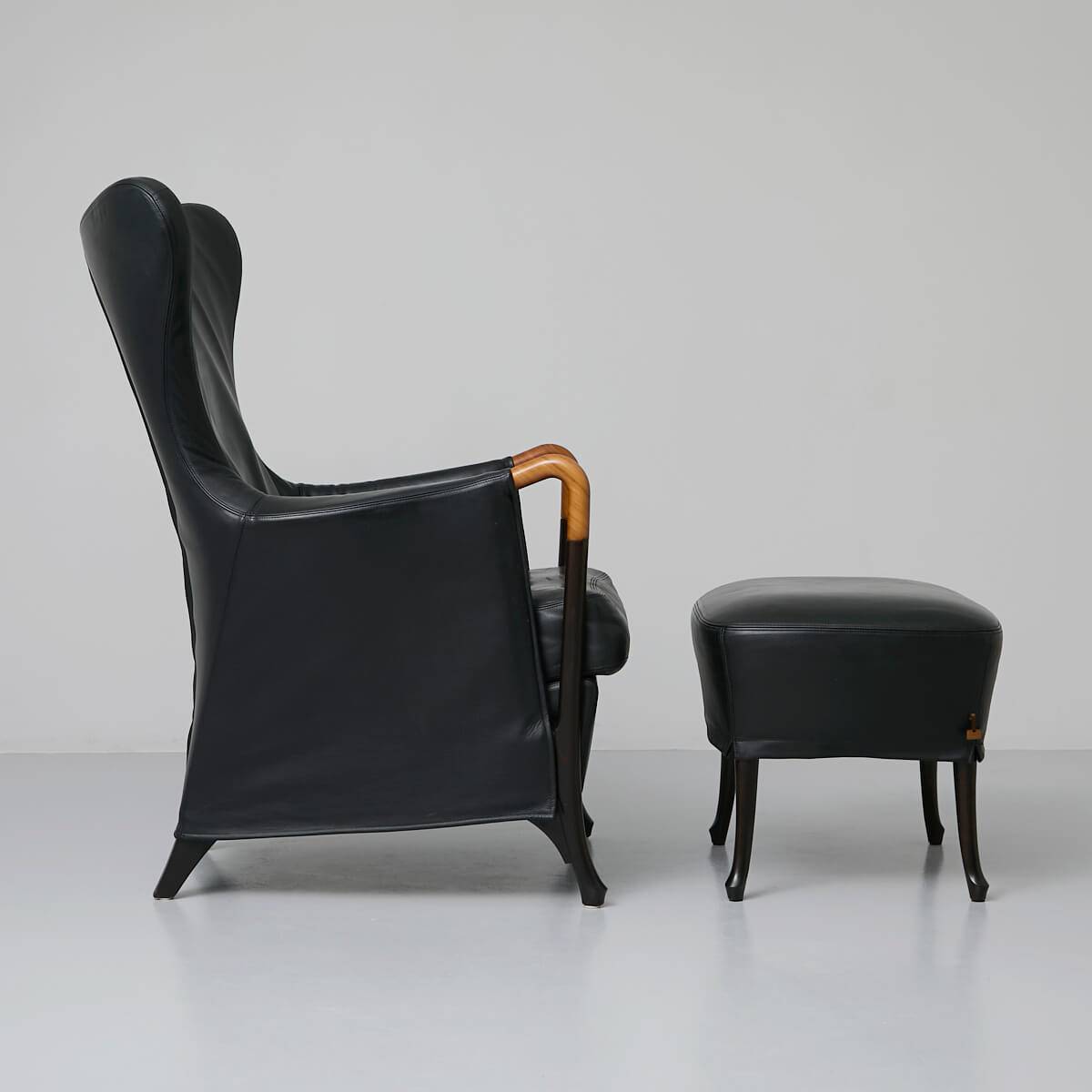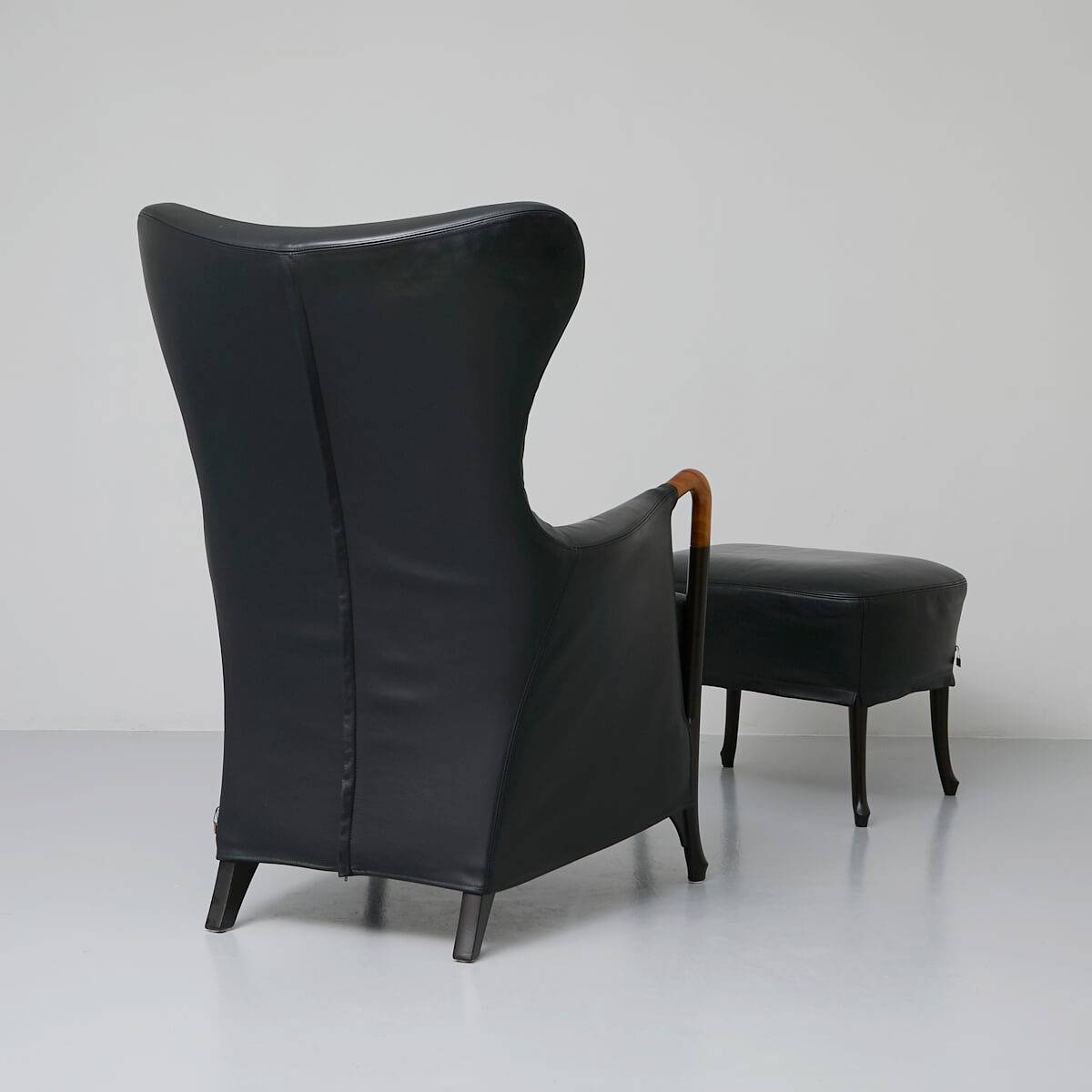 Hochlehner mt Ottoman. Bezug aus abnehmbarem schwarzem Leder, Beine und Armlehenen aus lackiertem Nussbaumholz. Progetti Sessel ein Design von Umberto Asnago für Giorgetti. Preis inkl. Hocker. Sehr guter Zustand.