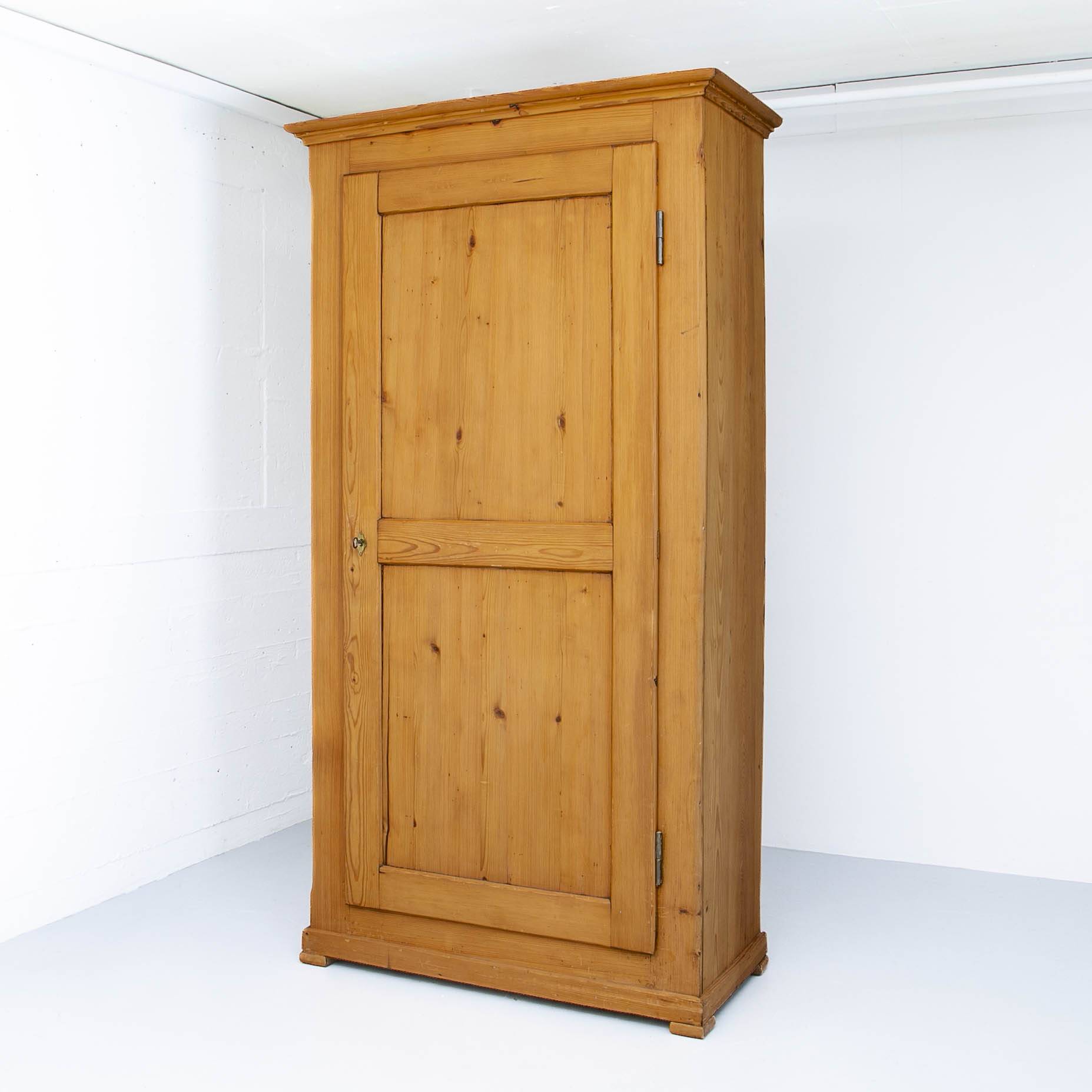 Hoher Tannenschrank. Hergestellt aus massivem Tannenholz. Innen zwei feste Tablare und eine Kleiderstange, Tablare mit Folie beklebt, ein Spalt an der Front (siehe Foto). Das Möbel soll eine Farbe oder ein neues Polster bekommen?