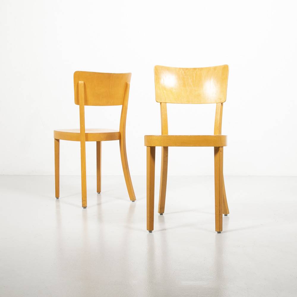Holzstuhl mit breiter Lehne von SEM. Gestell aus massiver, lackierter Buche, Sitzfläche und Rückenlehne aus lackiertem Fromschichtholz Buche. Schweizer Fabrikat. Guter Zustand mit wenigen Gebrauchsspuren. Stückpreis.