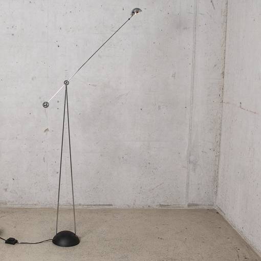 “Stehleuchte aus verchromtem Metall des italienischen Designers Paolo Piva für Stefano Cevoli aus den 1980er Jahren, Modell “”Yuki””. Verstellbarer Reflektor, Gelenkarm von oben nach unten schwenkbar. 360° drehbarer Fuss.”