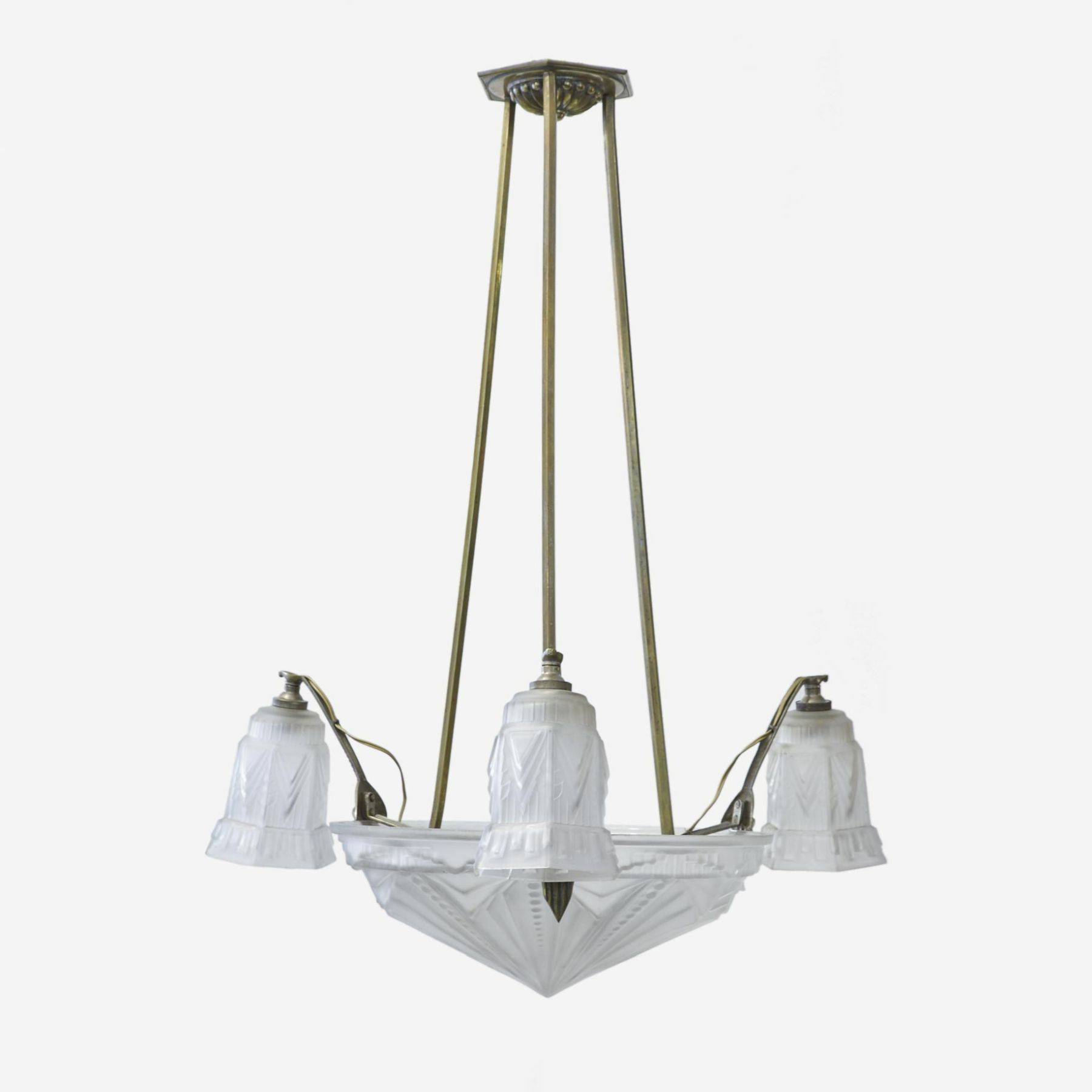 Jugendstil Deckenlampe mit Milchglas Lampenschirmen und Messing Gestänge.