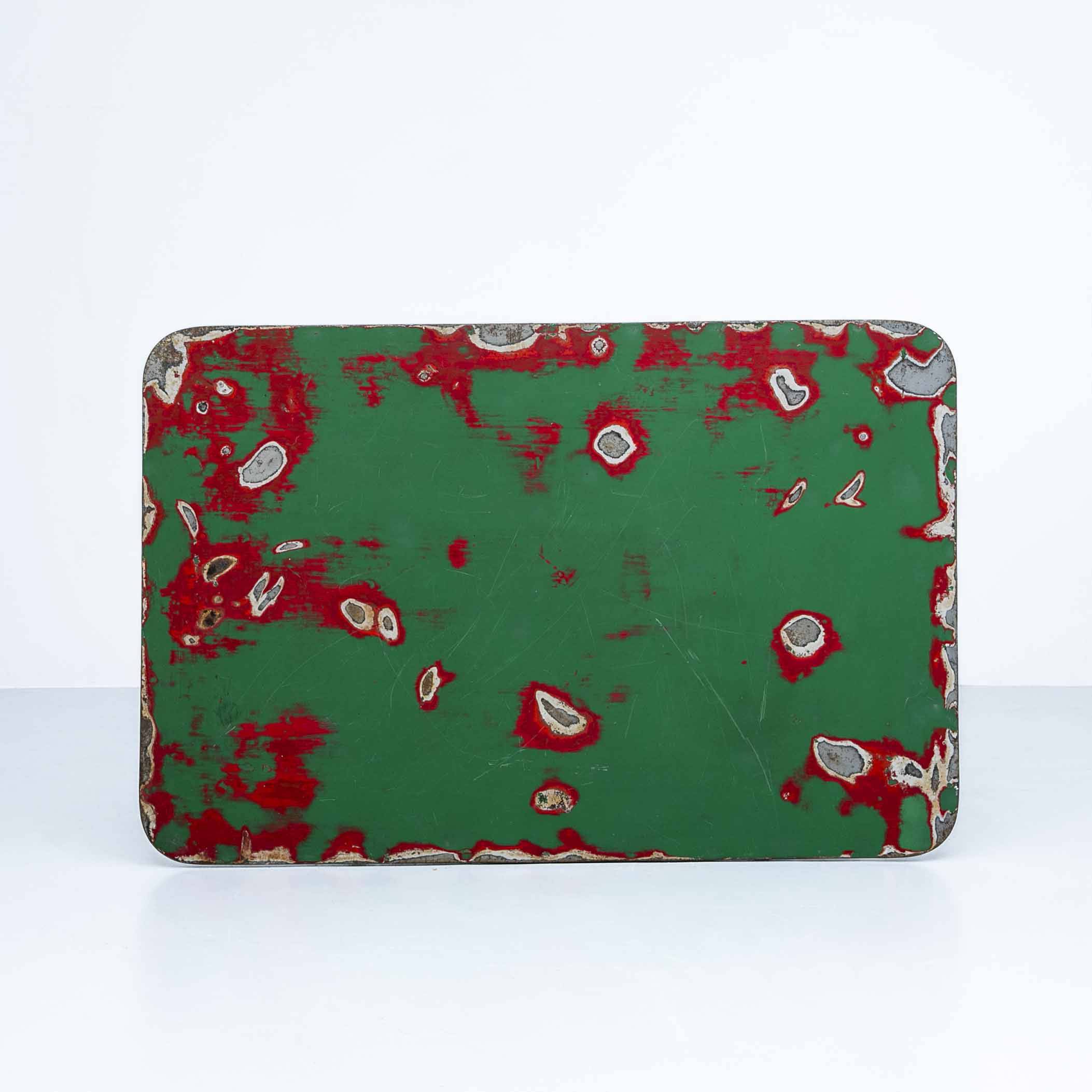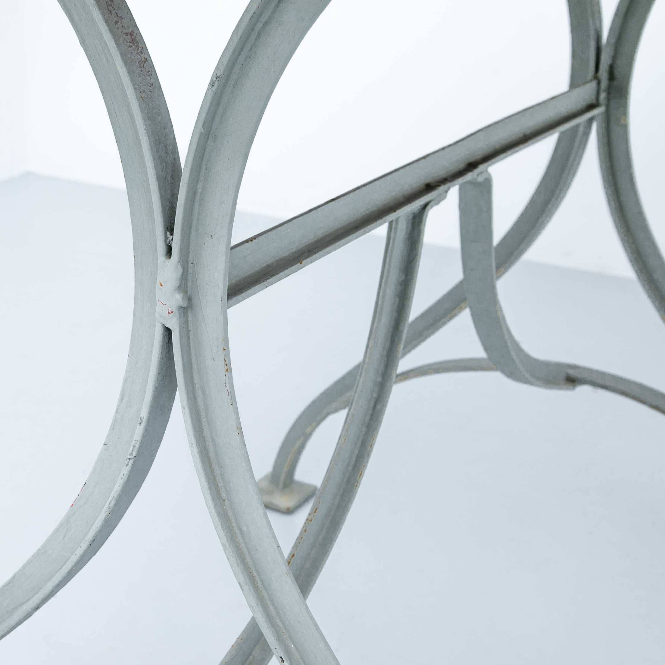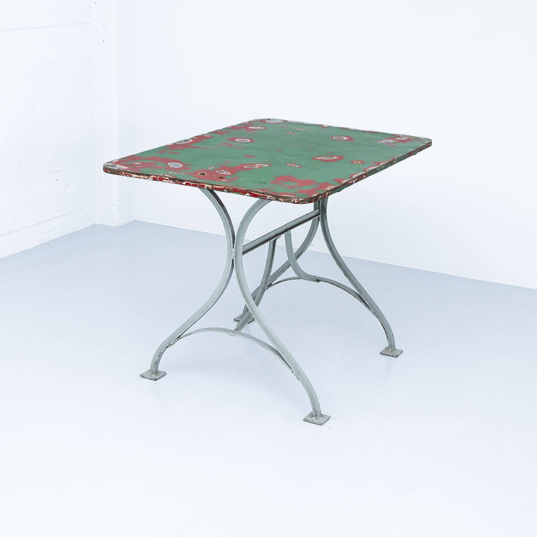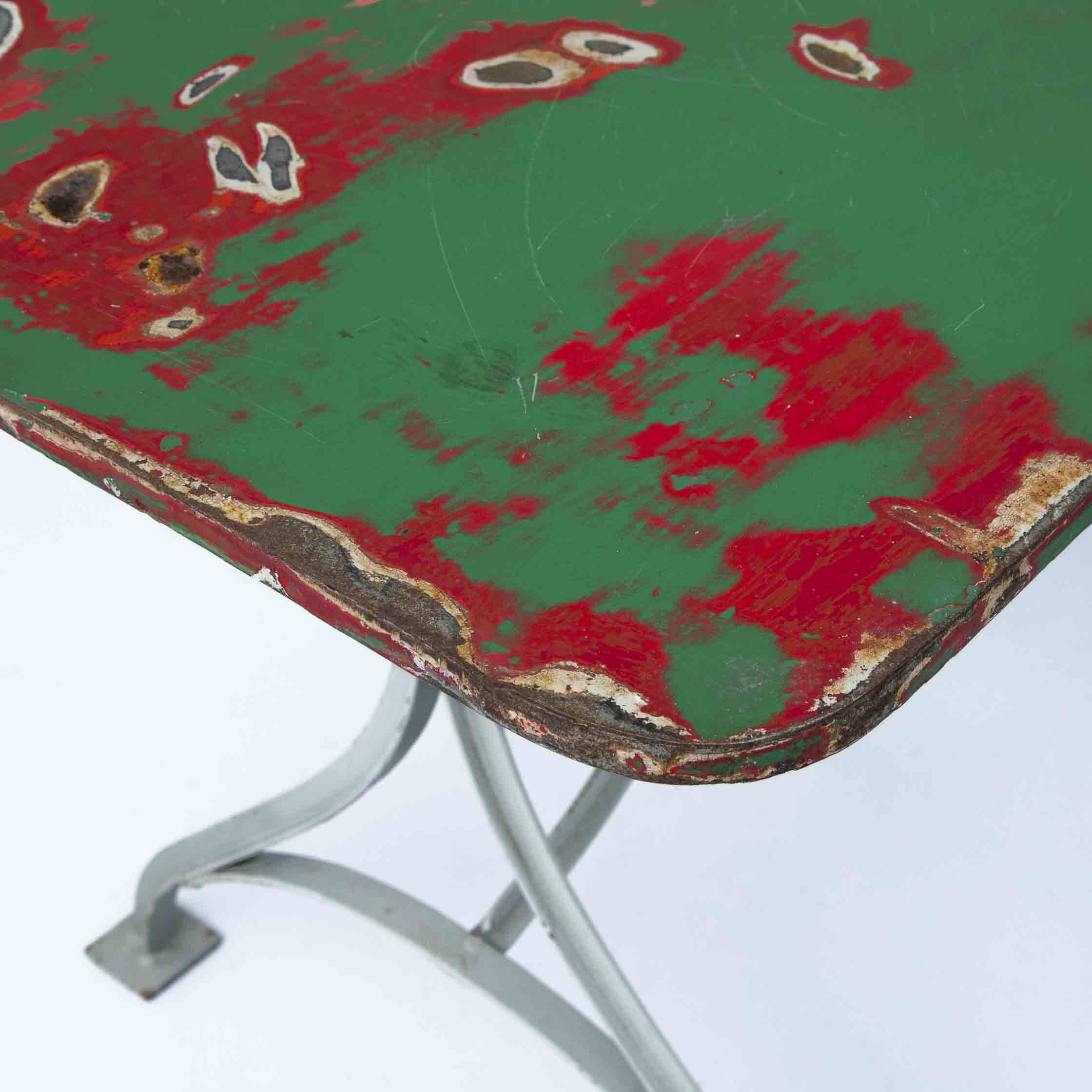 Jugenstil Gartentisch 99 x 65 cm. Gestell grau lackiert, Platte mehrfarbig. Mit Patina.