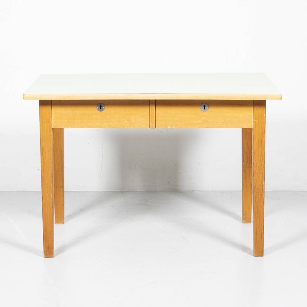 Kindertisch mit grünem Lino. Beine, Zarge und Fronten aus massiver, lackierter Buche. Die Tischplatte wurde in unserer Werkstatt mit blassgrünem Linoleum beklebt. Zwei Schubladen, ohne Schlüssel. Guter Zustand.