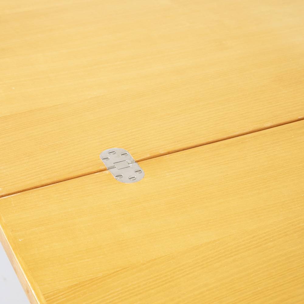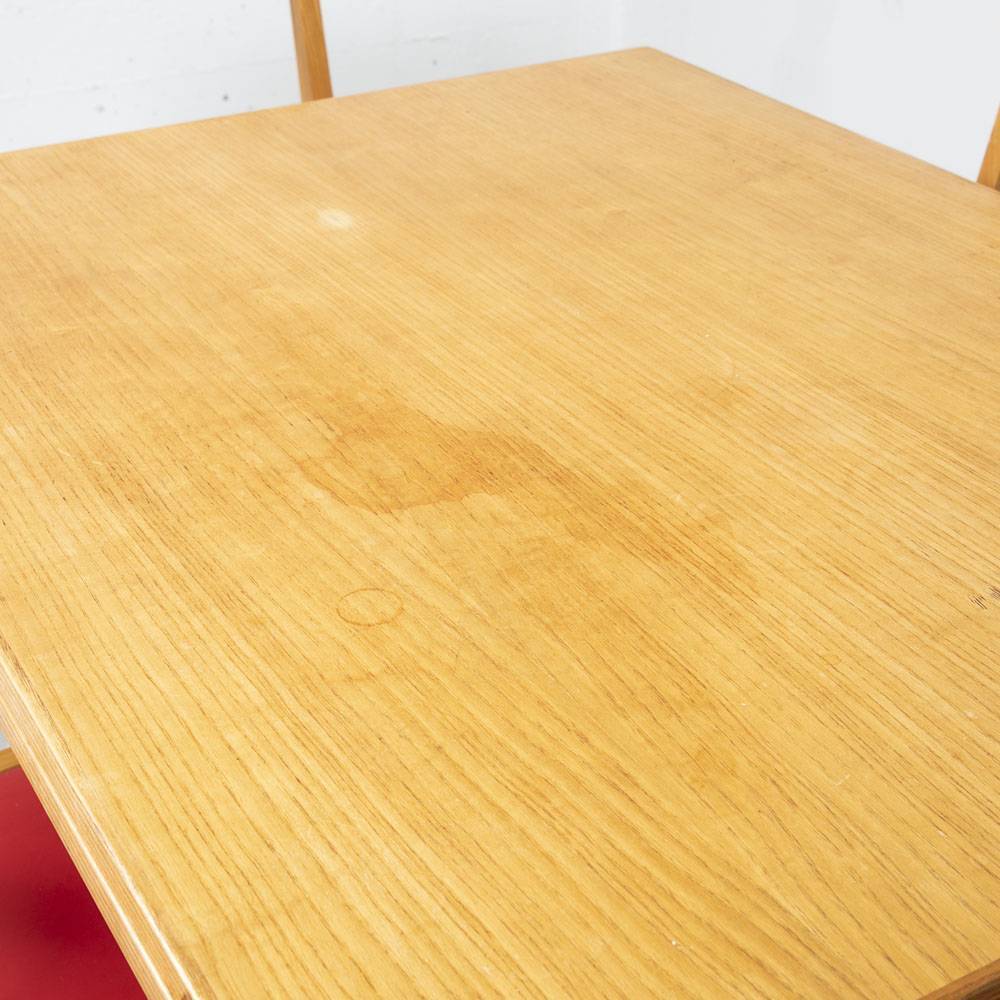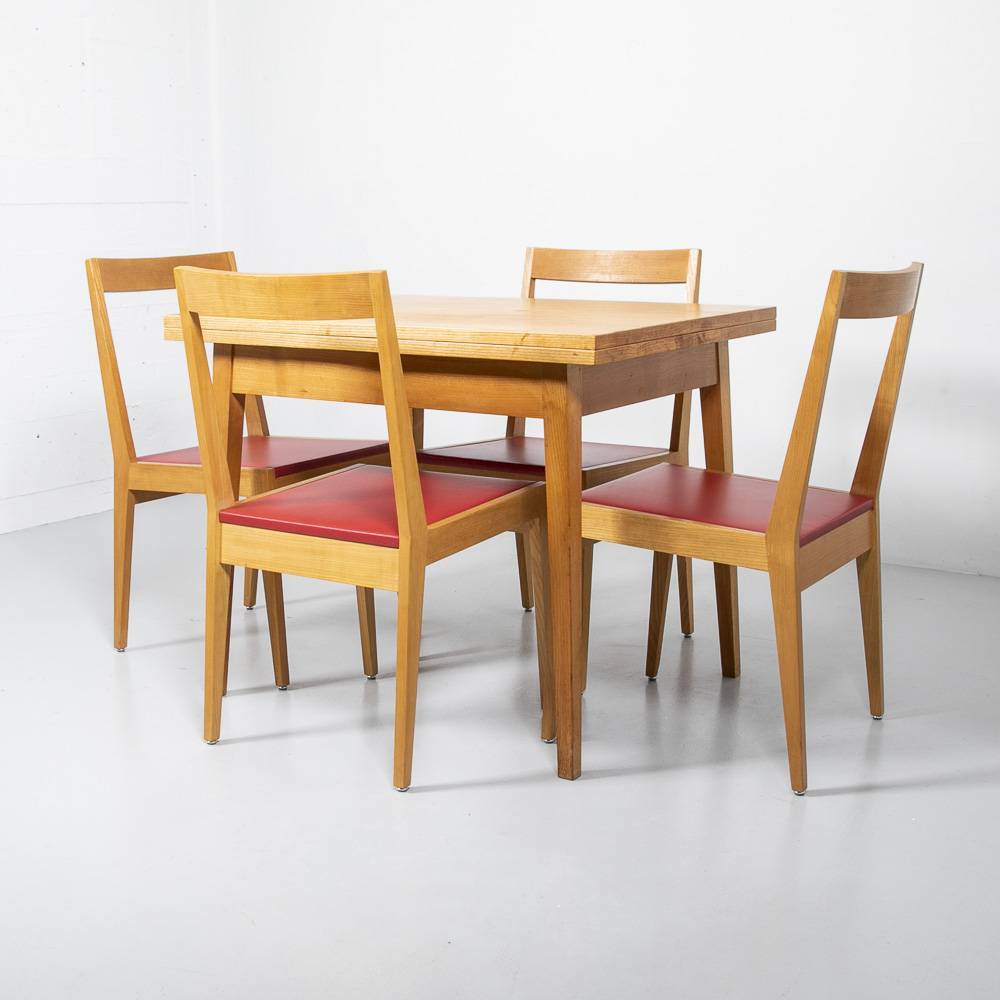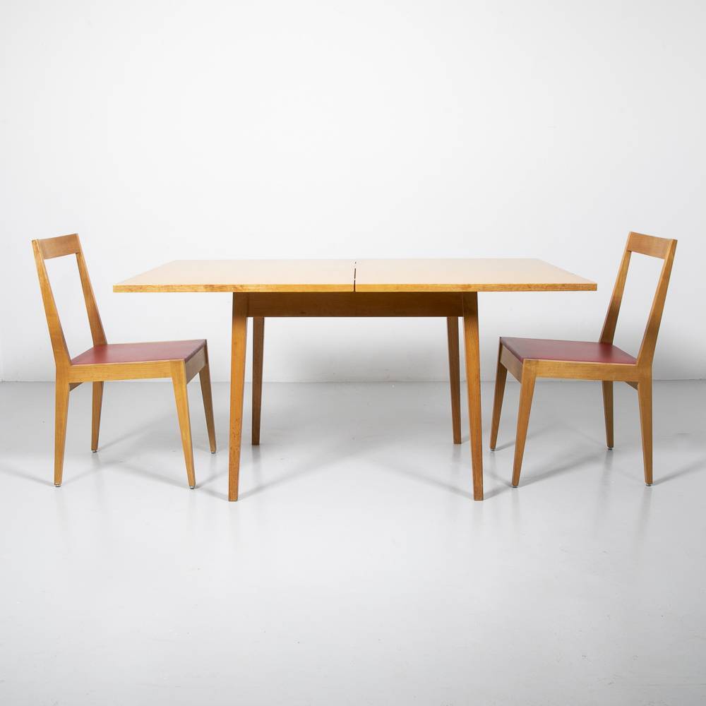 Klapptisch aus Esche aus den 1960er Jahren. Beine und Zarge aus massiver Esche, Tischplatte mit Furnier in Esche. Der Tisch lässt sich durch Aufklappen und Drehen auf eine Länge von 140 cm vergrössern. Mit Gebrauchsspuren auf der Platte.